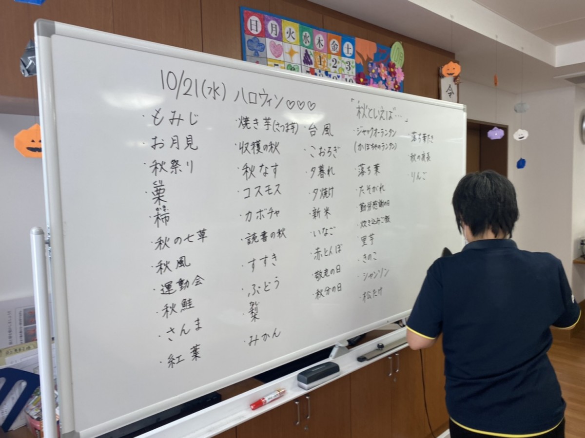 『秋といえば、、、』の言葉集めゲームに41もの単語が飛び出し☆脳も活性化されていましたよ☆ コロナ禍が続いていて大変な毎日ですが、内野本郷の皆様は笑顔が溢れています♡
