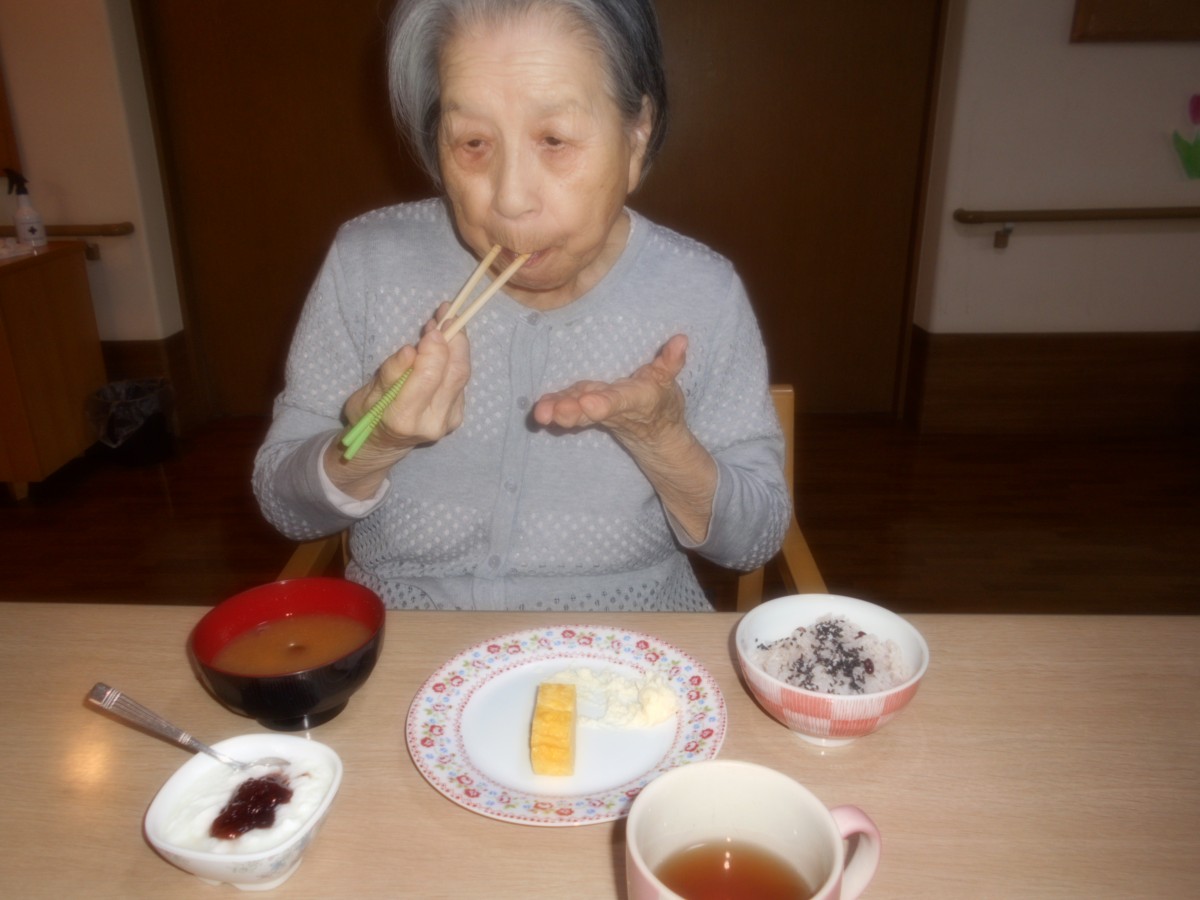 お赤飯、なめこみそ汁卵焼き、ポテトサラダ。デザートはヨーグルトでした。