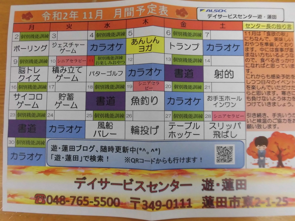 遅くなりましたが、来月11月の予定表ができましたので、こちらの方でもご紹介のほう致します。