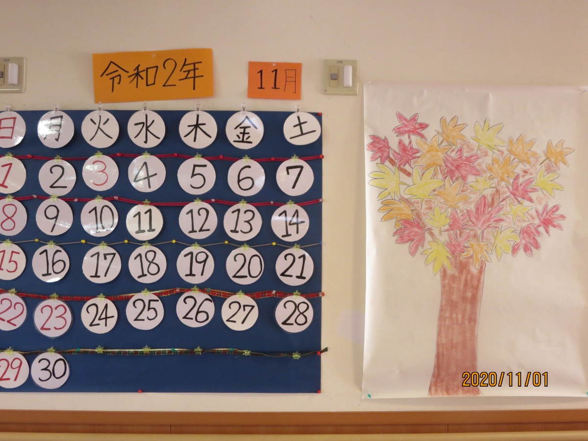 今月は、紅葉の時期なのでもみじの絵を書いて