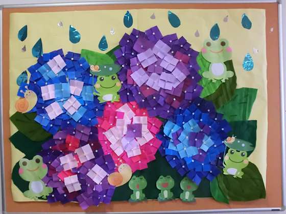 1階では今年の干支たちが迎えてくれます。6月は梅雨のアジサイを作成しました。2階のアジサイは、職員も手伝いました。施設の中も華やいでおります。