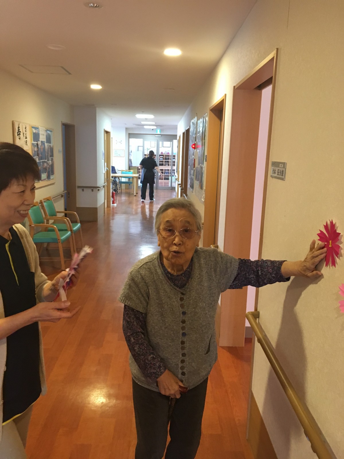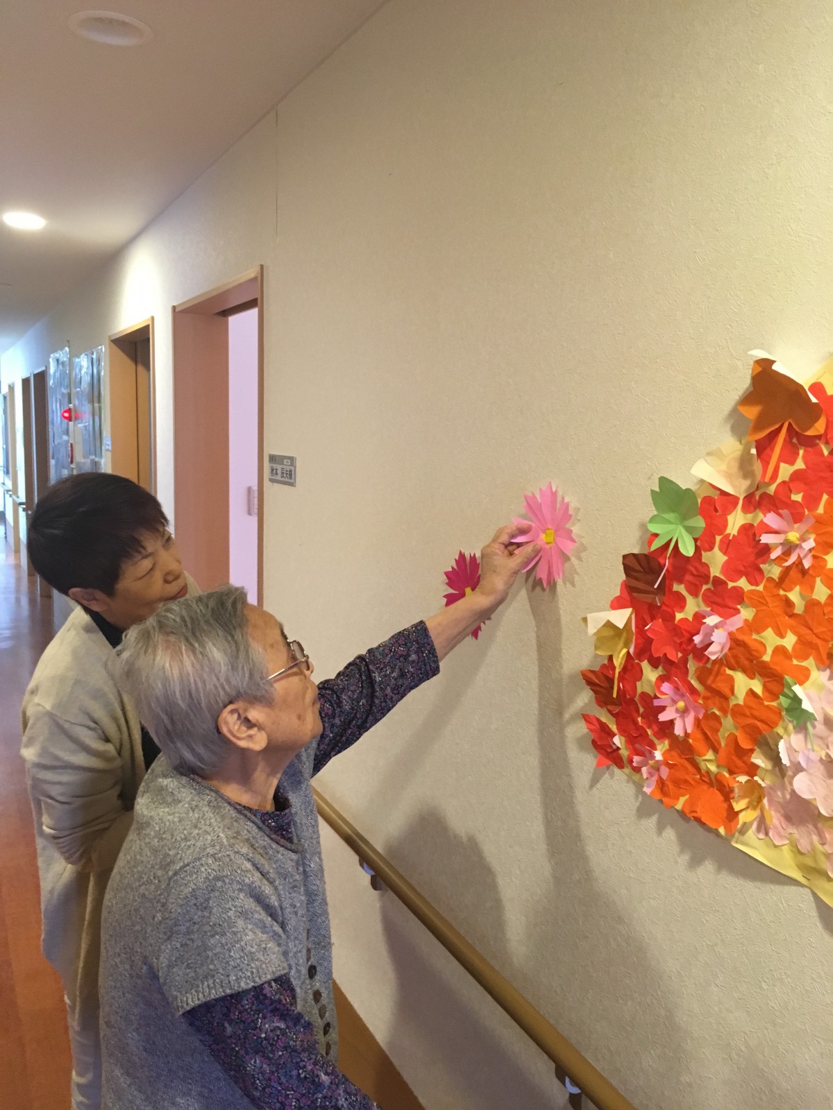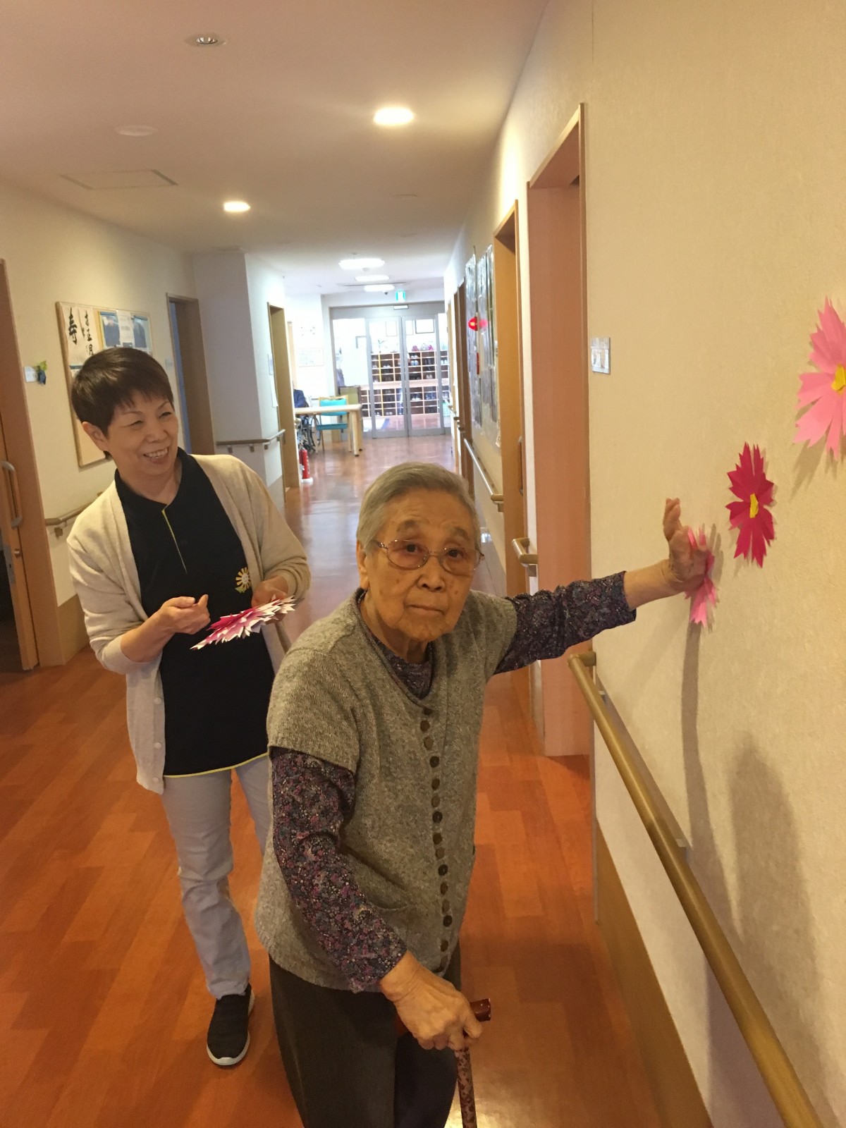 レクリエーションのご様子です。皆さんで作ったお花を壁に貼って頂きました!廊下がぱーっと明るくなりましたよ~