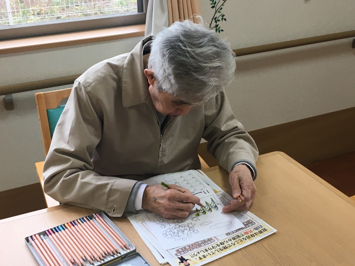 こちらの男性は塗り絵に夢中です。細かい部分もきれいに塗られています。この方はとってもお上手で完成した作品を見るのが毎回楽しみです。