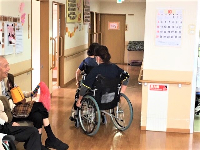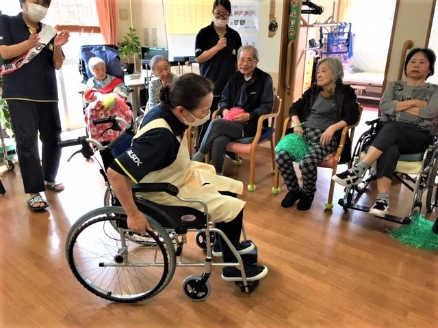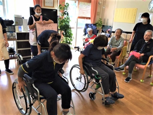 毎年、職員も何かしら競技に参加してもらいますが、今年は車椅子リレーを行いました。