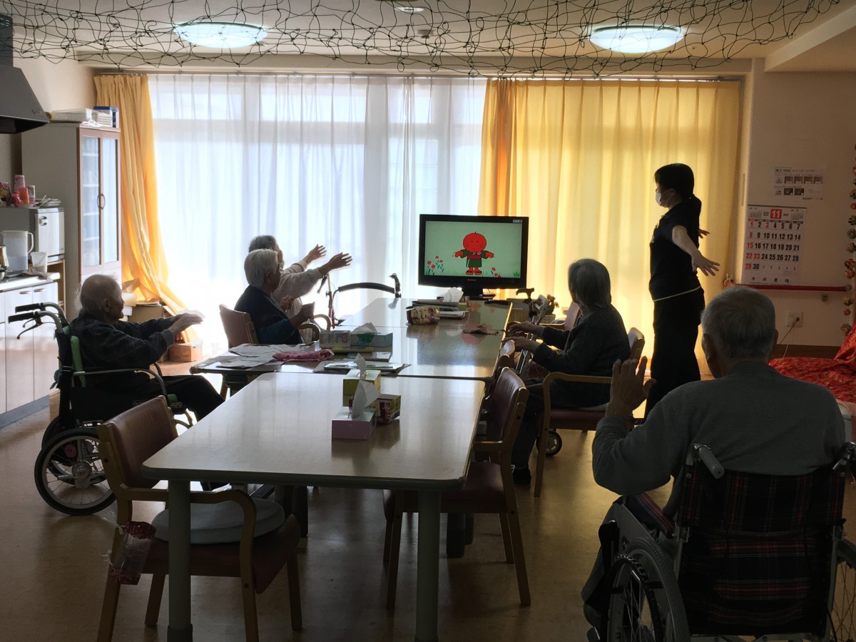職員と一緒にテレビを見ながら、元気に体操を行いましょう!!