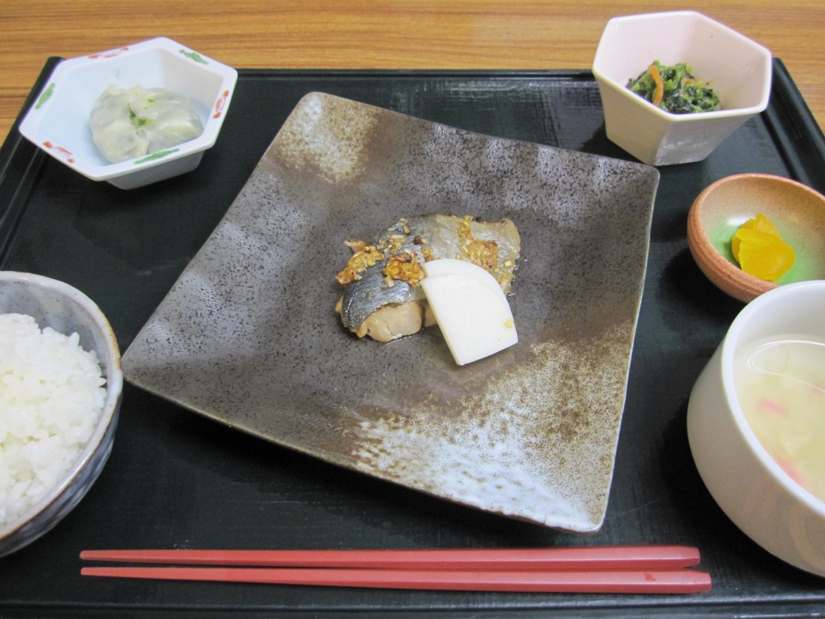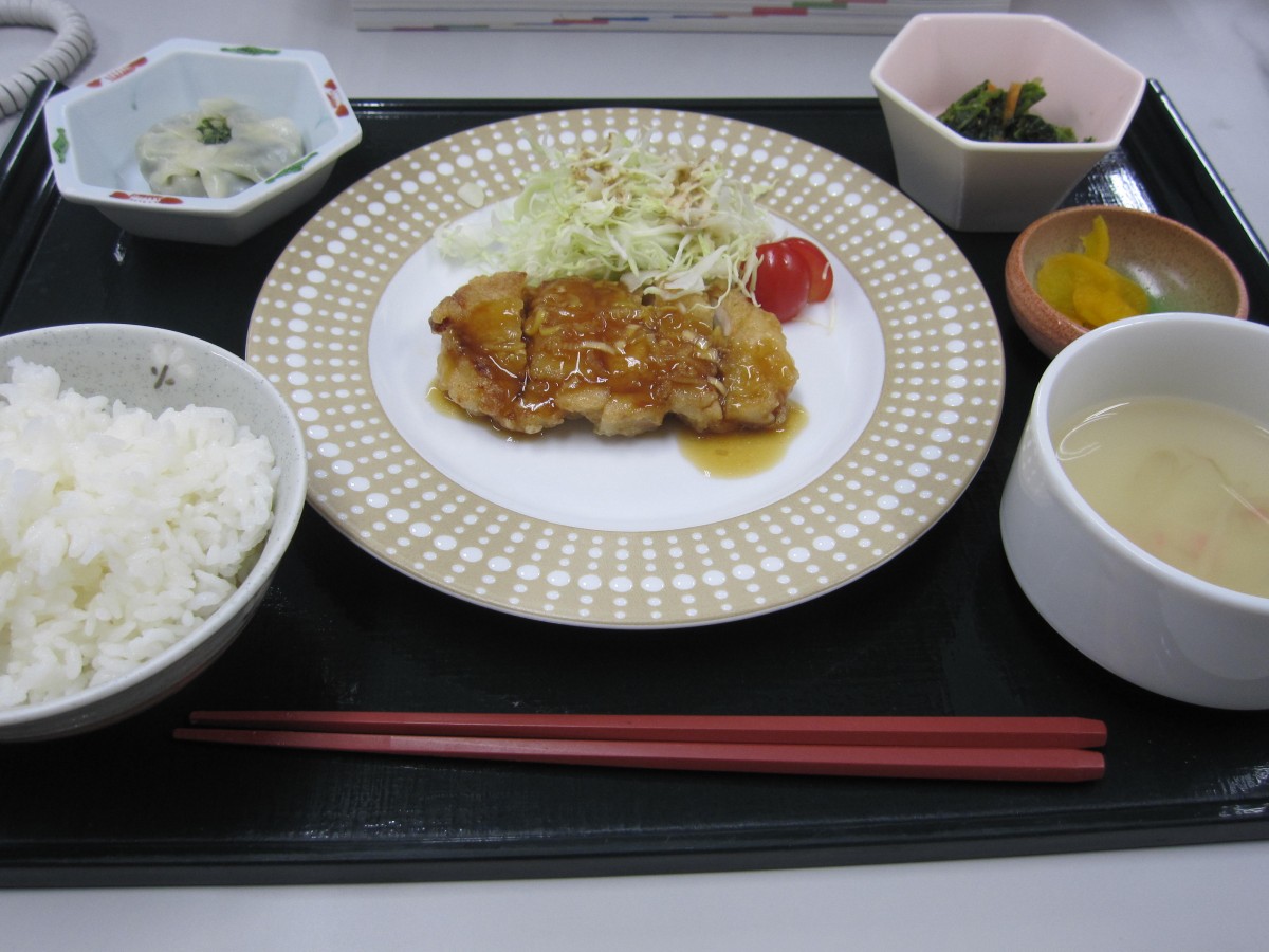 油淋鶏 にら饅頭 ほうれん草のナムル 小付け 中華スープ 御飯
