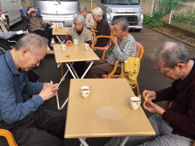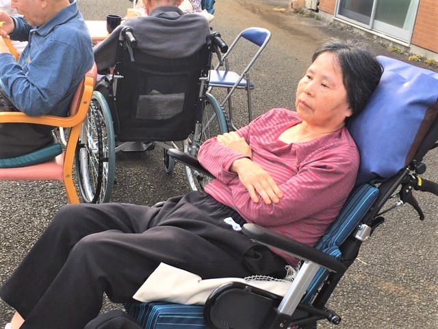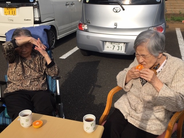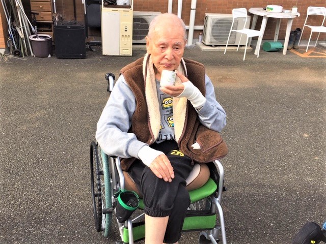 テキパキと行動開始され、普段より早めの休息を促し、2階職員へ内線。「1階外気浴準備しますので、2階の方も、降りて来て下さい」と連絡。