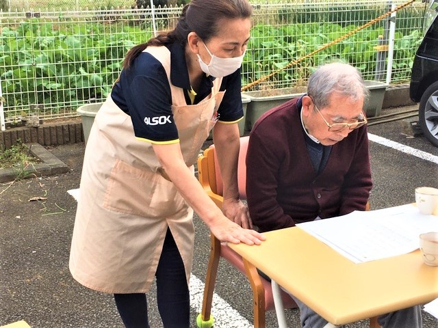 休息時間を終えると、早速入居者様へ声掛けしながら、外へと一人一人安全に誘導。