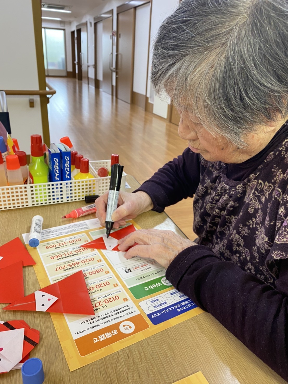 今日の午後は、少し早いですが『サンタクロース』を折り紙で作りました(๑˃̵ᴗ˂̵) スタッフと一緒にYouTubeを観ながら楽しく作成(笑) お顔もマジックで書きましたよ♡ 『今はこんな便利な物があるのね!』『本より分かりやすいわ♪』『可愛い!次は違うものも折ってみたいわね♡』など盛り上がりました(^。^) ◉手指を沢山使いリハビリとなる ◉注意力の向上 ◉達成感の享受 ◉昔のことを思い出し、周囲の方々と話しながら作ることで『回想法』に繋がる など、折り紙は良いことずくめなんですね☆ また是非やりましょうね♪