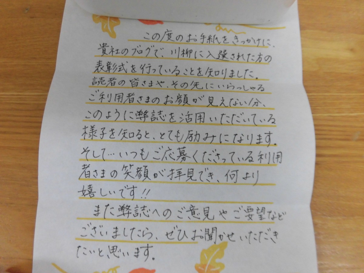 さて今回なのですが、いつも月間デイで介護川柳を定期的にご紹介しているかと思いますが、実は編集部の方からお手紙をいただいたので、少しご紹介できればなと思います♪