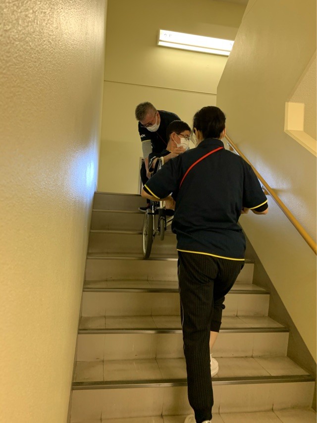 入居者様をおぶったり。。車椅子のままでの移動の練習もしました!