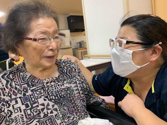 入居者様とケアスタッフが、お顔剃りについてお話しながら爆笑してたのでパシャっと
