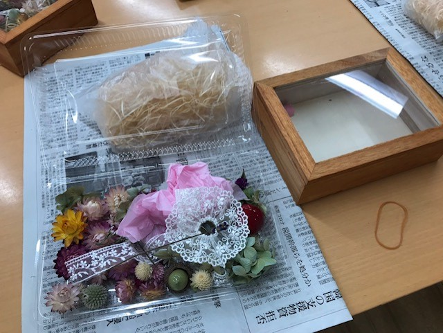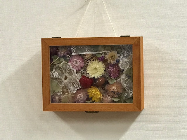 ボックスの中にドライフラワーやリボンを配置してオブジェを作製していただきました。