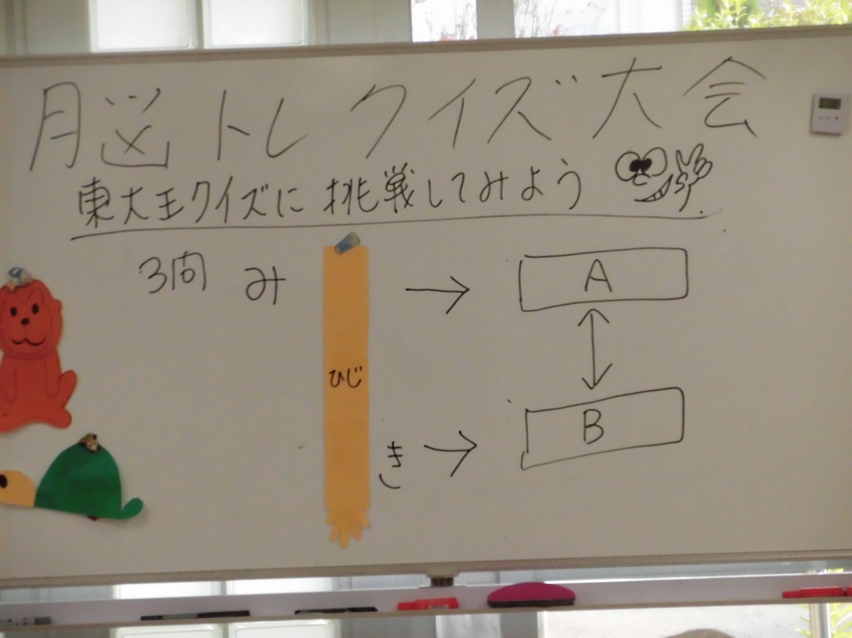 さて今回ですが、書道の日を今回行う予定でしたが、担当の先生が不在になってしまったので、今回は急遽「脳トレクイズ大会」の方に変更となりました。