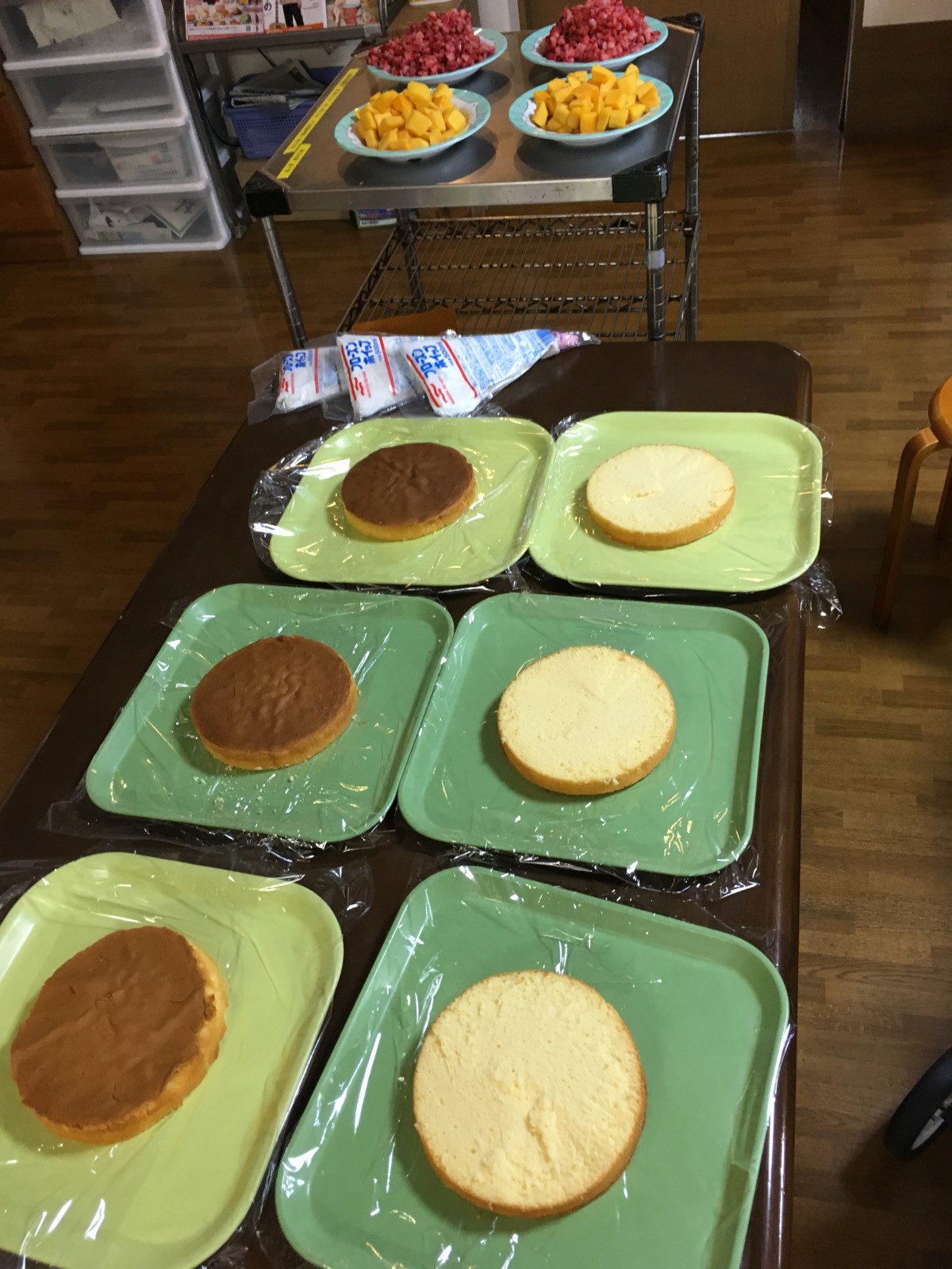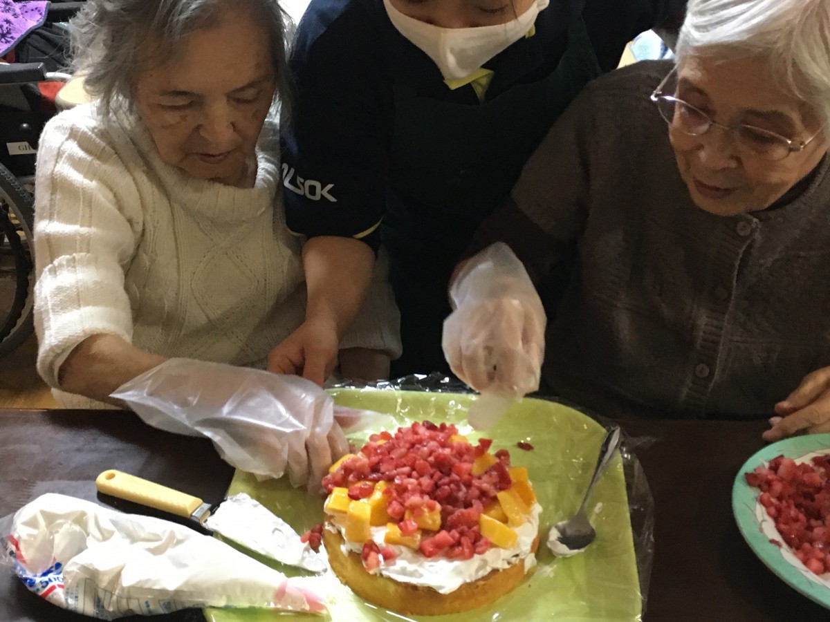 各階、代表のご利用者様に参加していただき、スポンジケーキとホイップクリームとフローズンフルーツとを使ってデコレーションケーキを作っていただきました。
