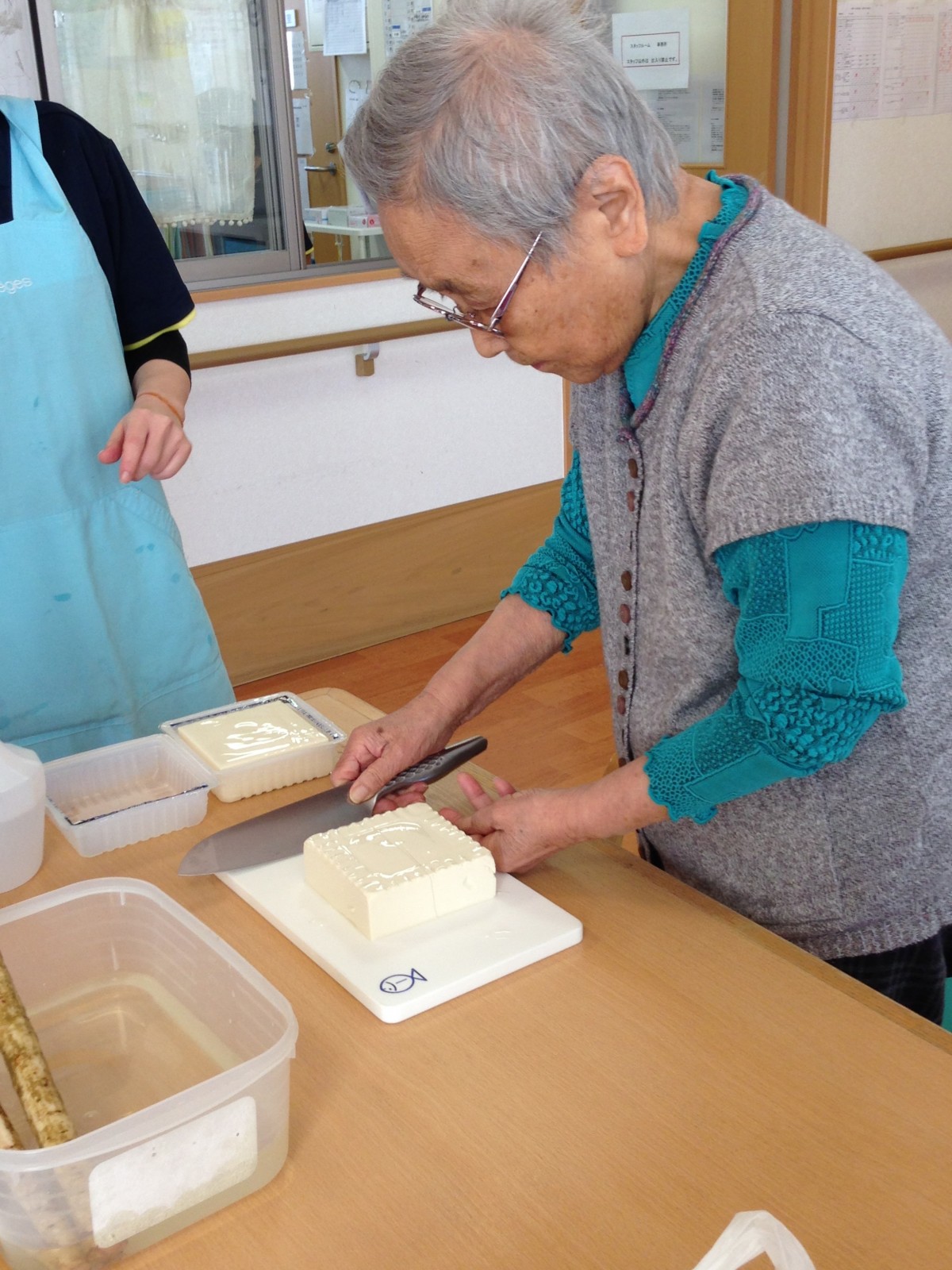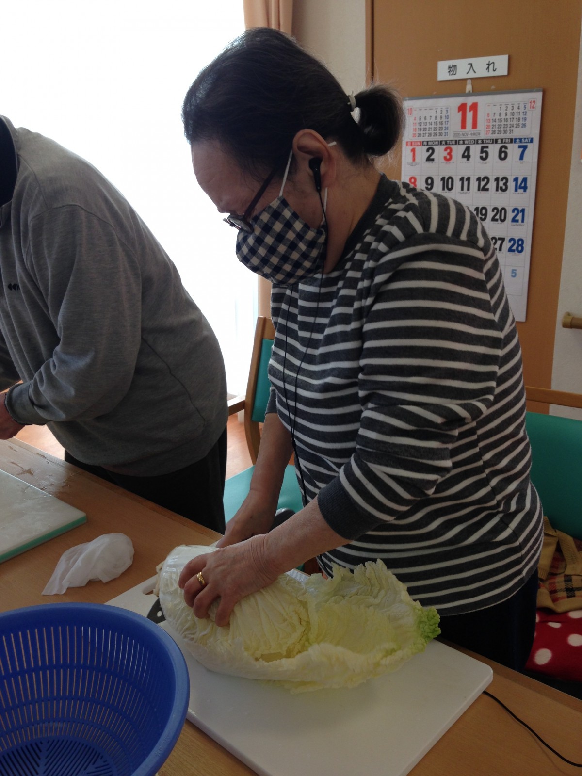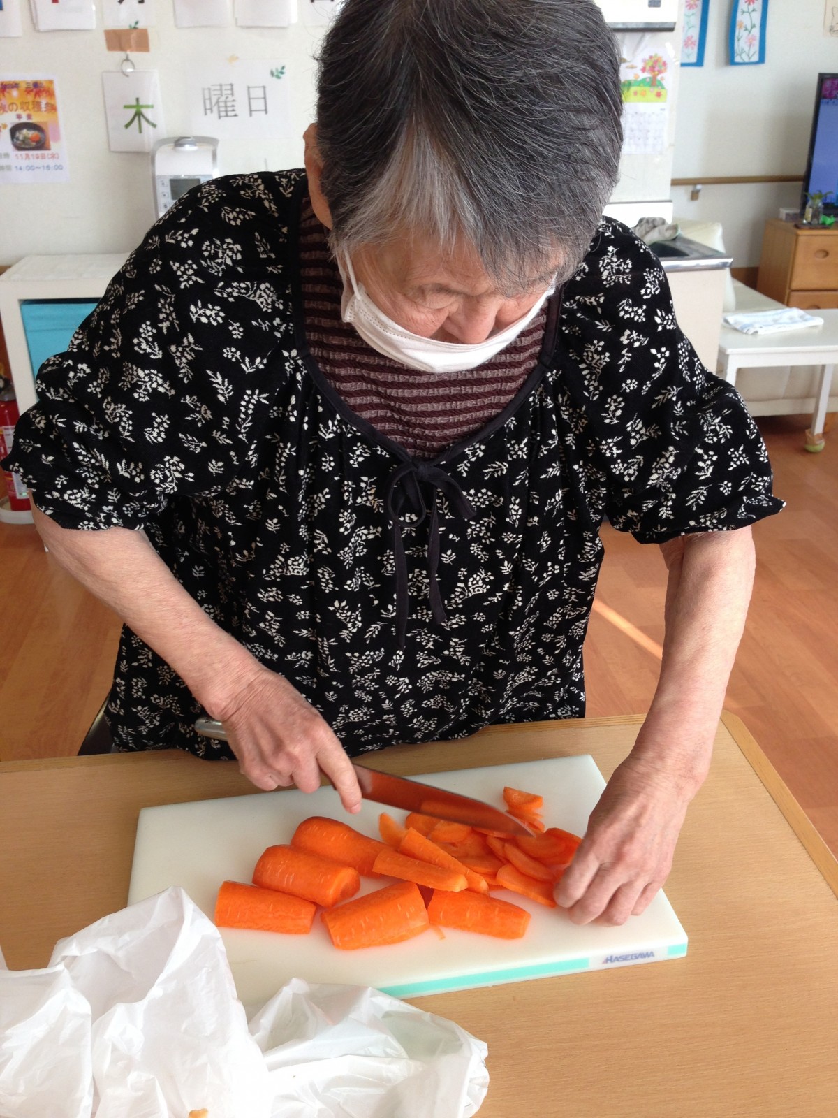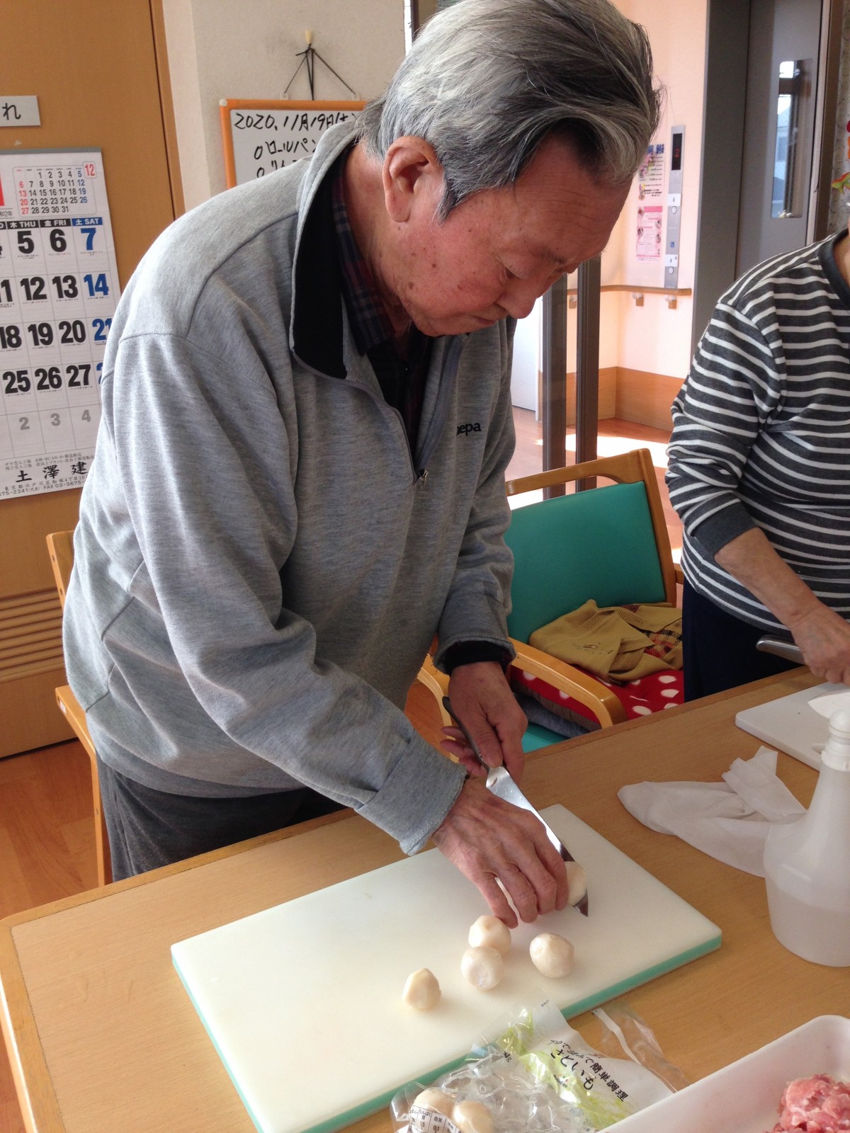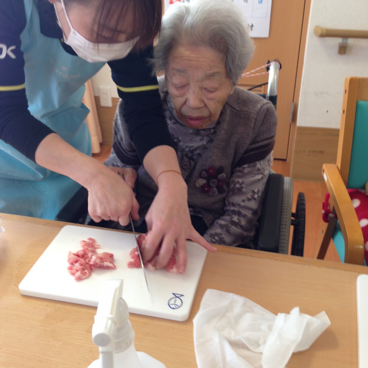 利用者様にも野菜やお肉などの具材を切っていただきました。皆さんさすがの包丁裁きでしたよ!利用者様に切っていただいた具材をお鍋でコトコト煮込んで完成!