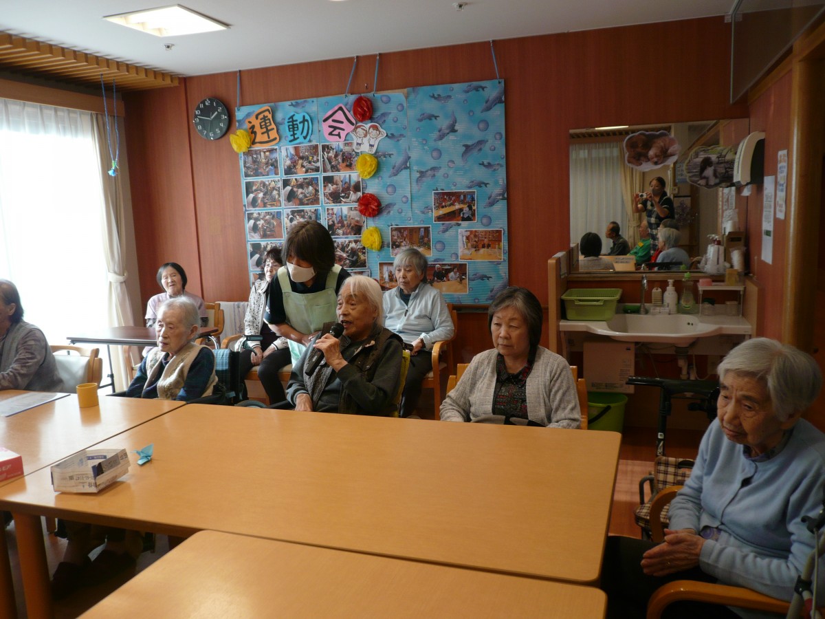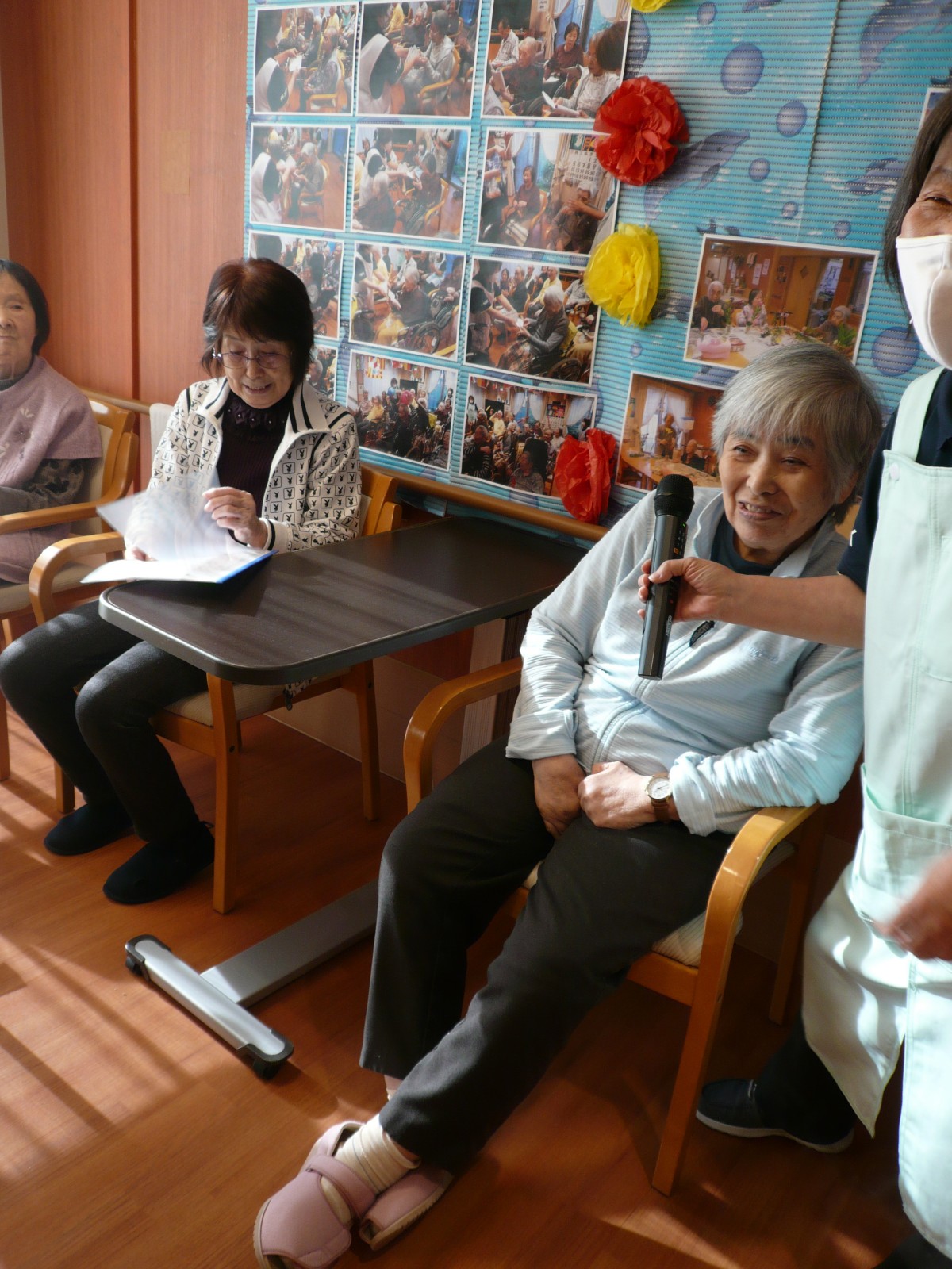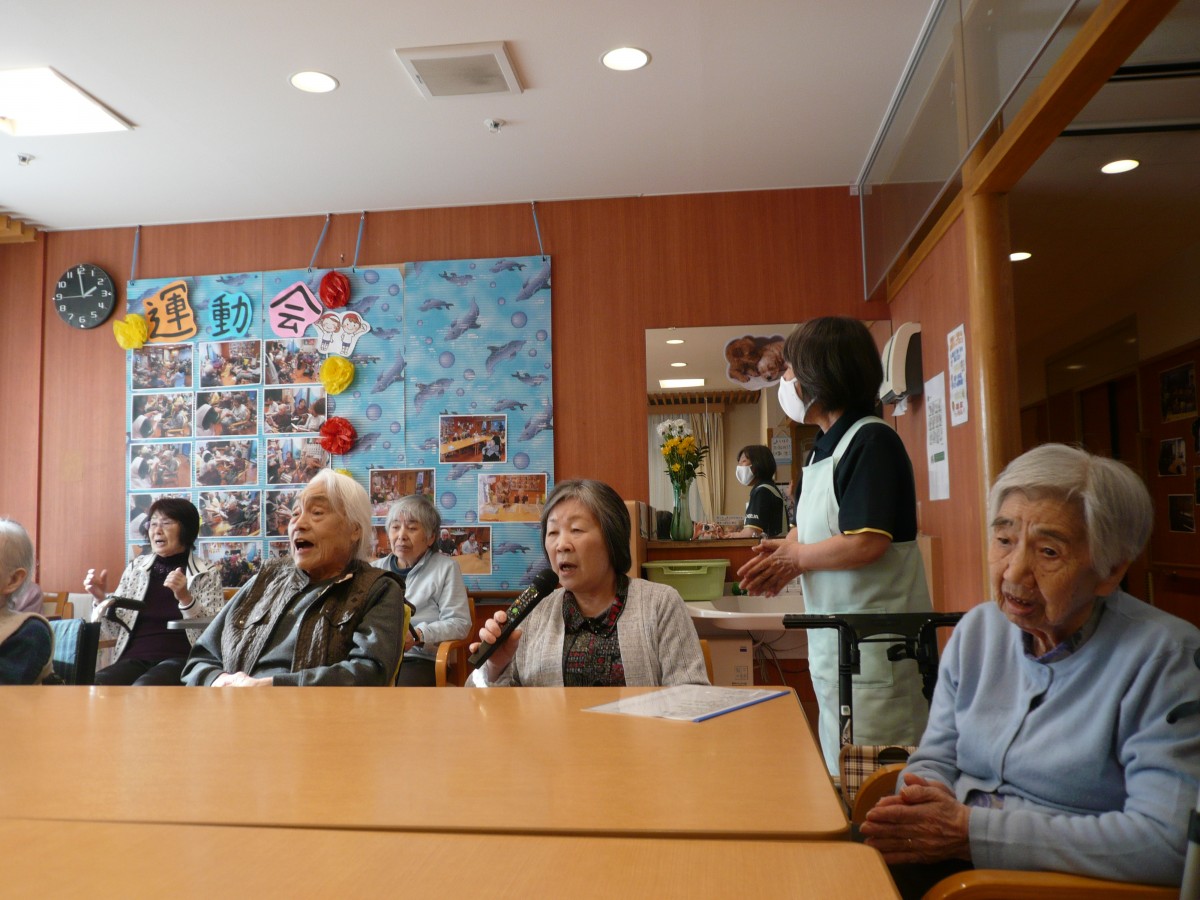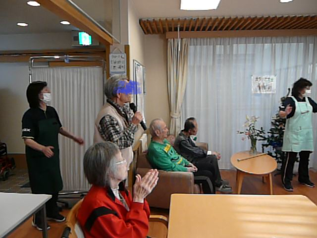 今日は1階ホールに皆さん集まって頂き、カラオケ大会を開催致しました。
