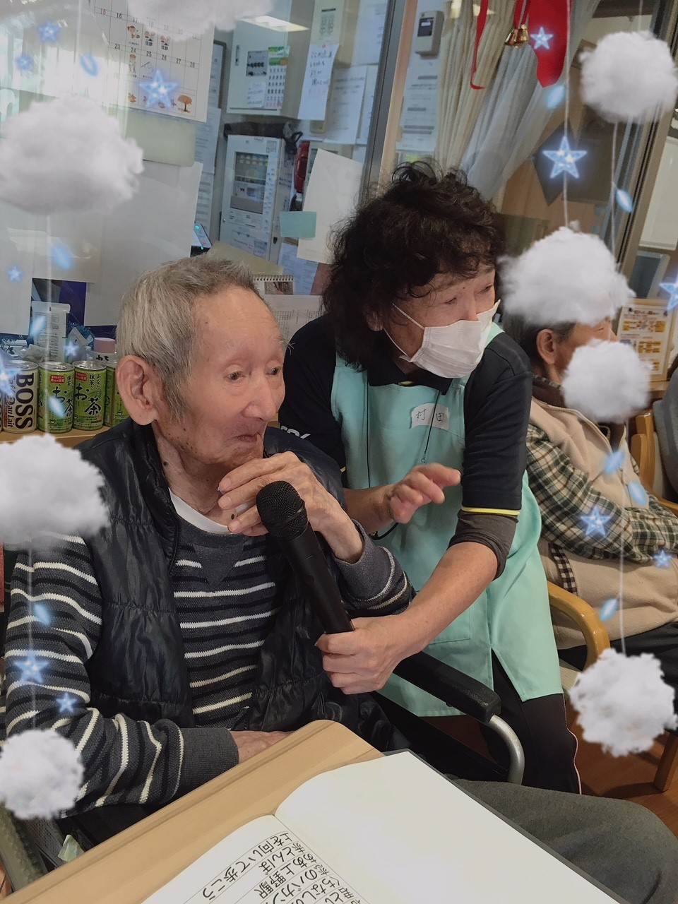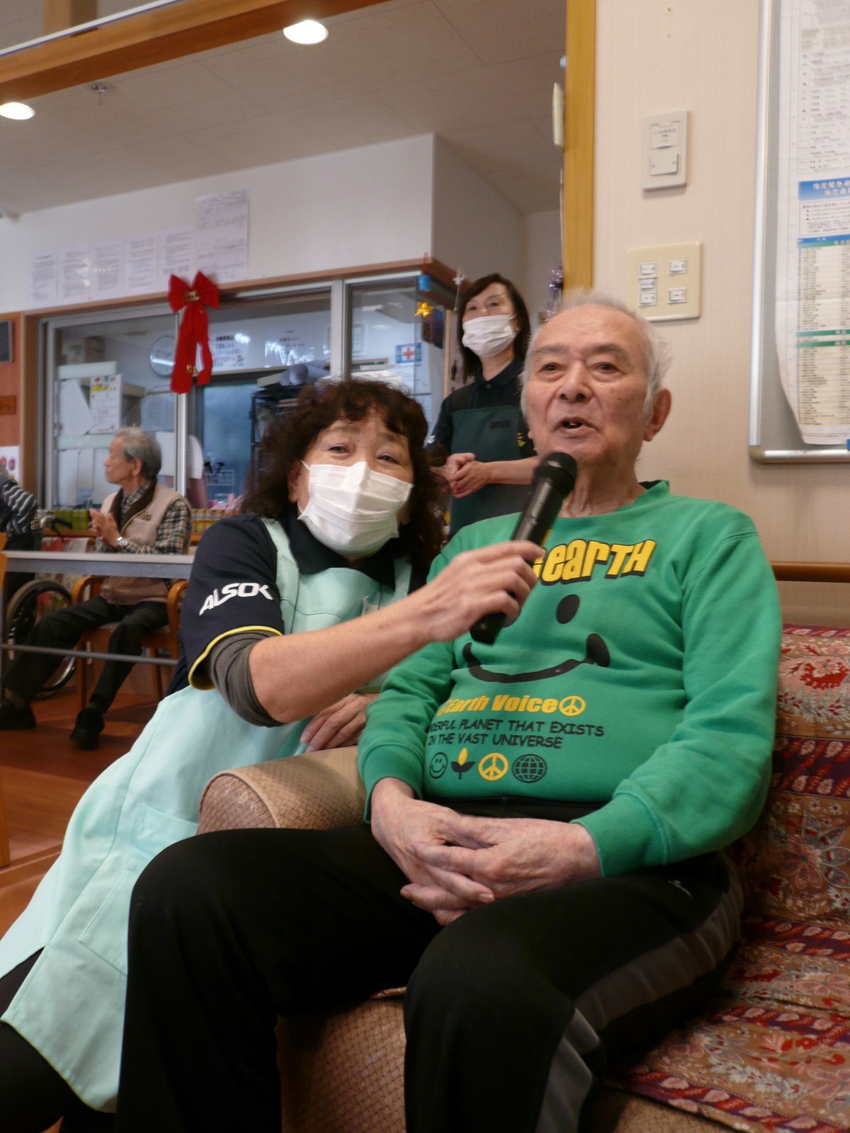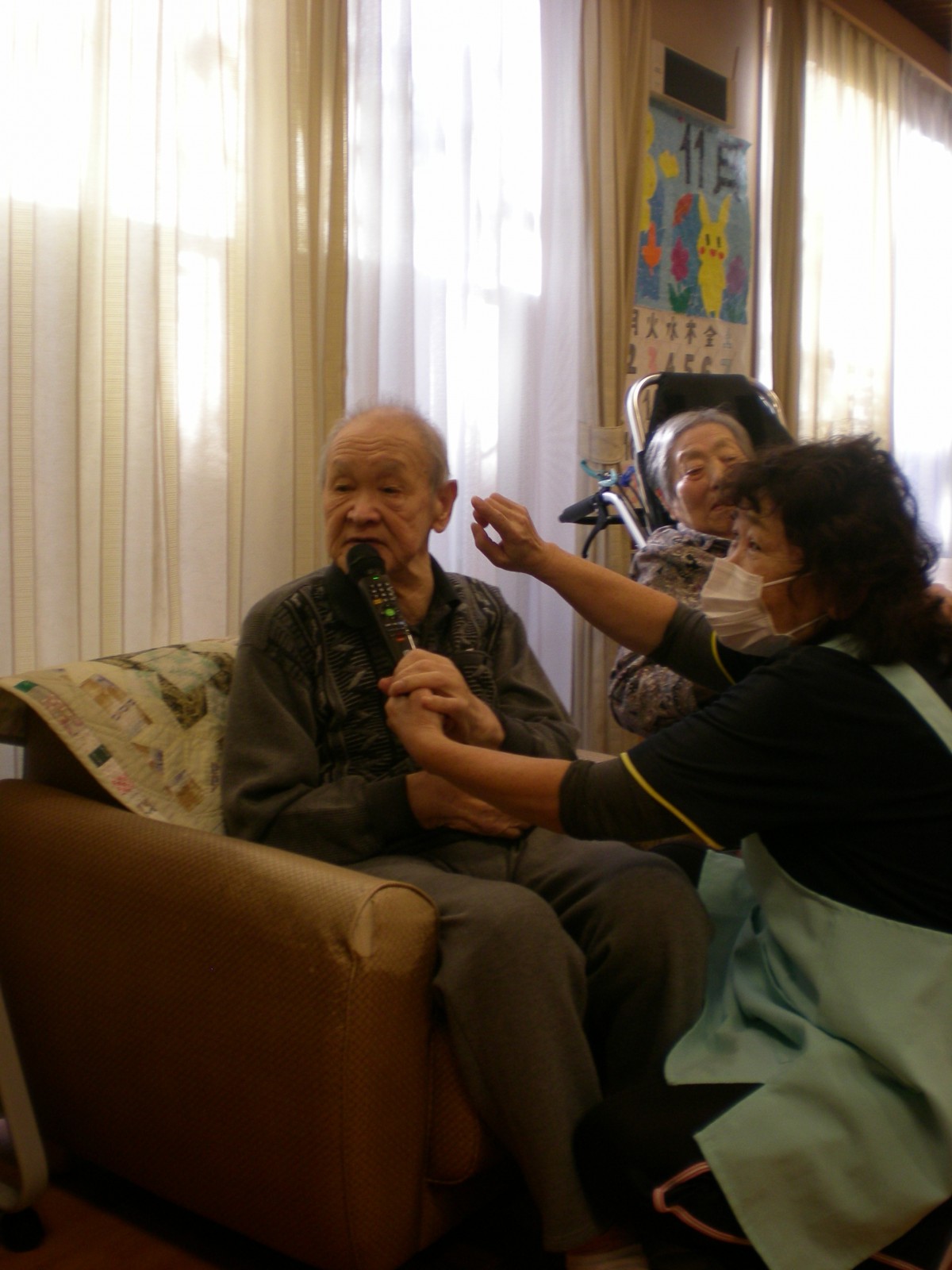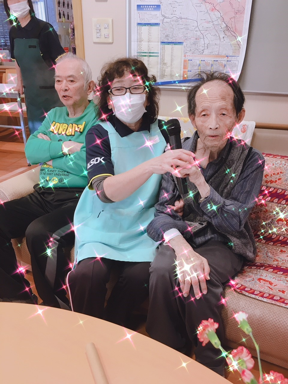 今日は1階ホールに皆さん集まって頂き、カラオケ大会を開催致しました。