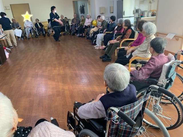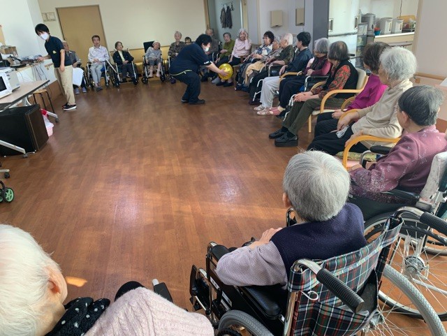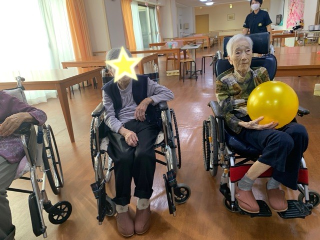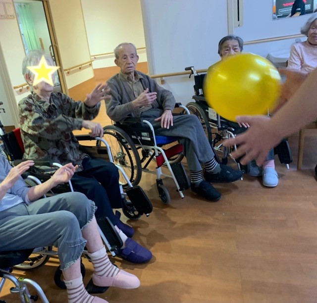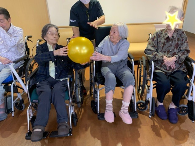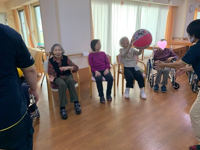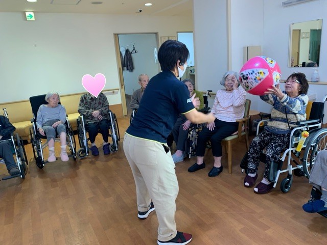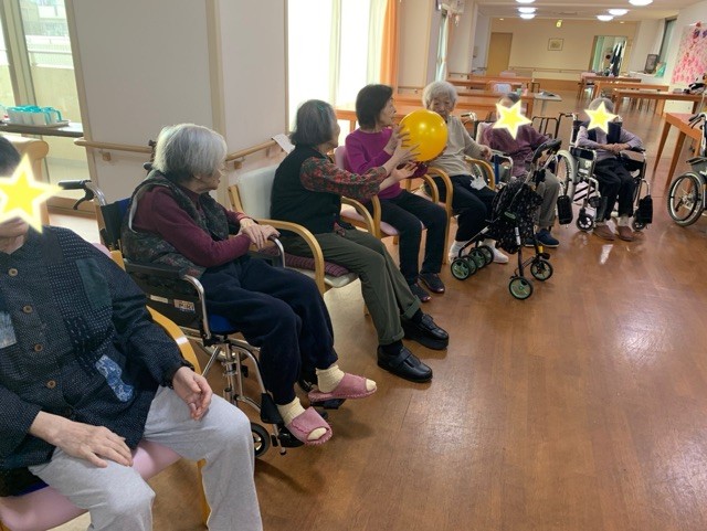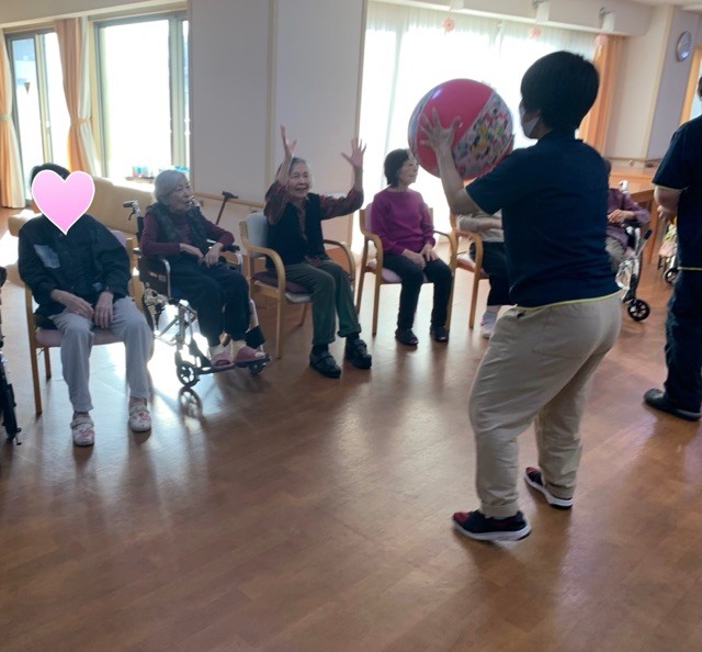 曲を流しながらボールを回して行きます!!曲が止まったら、ボールを手にされている入居者様がスタッフに投げる!!