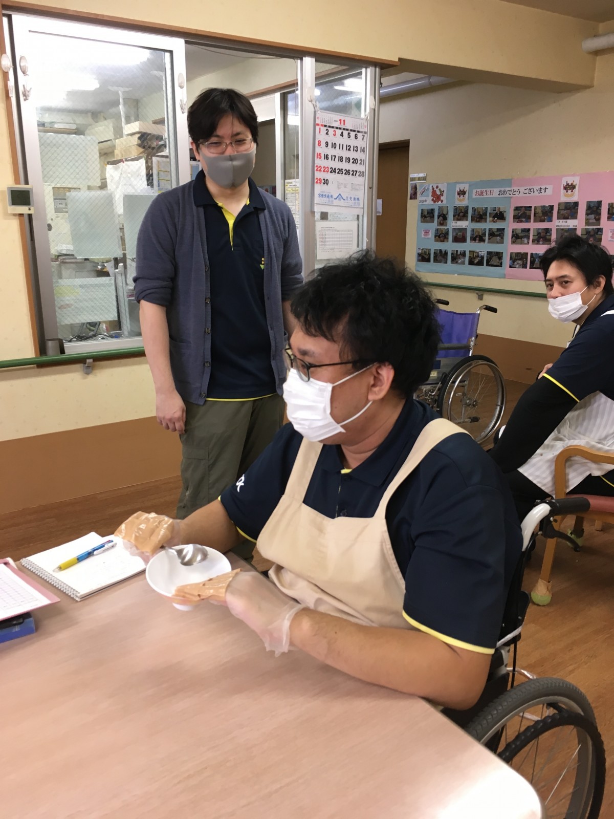この写真は左麻痺でコールを行動範囲以外に置くとどうなるかを体験しています。手の届かない所に置かれたら呼びたくても呼べない等かなり不満・ストレスが溜まると思われます。