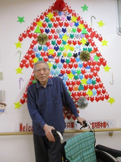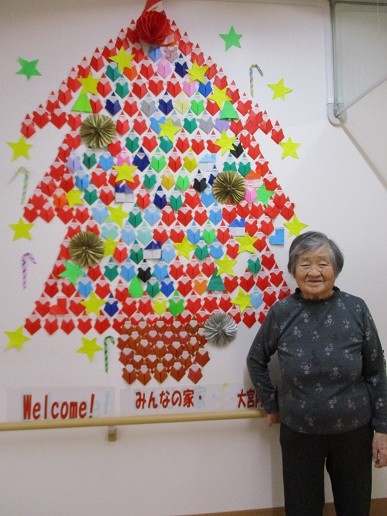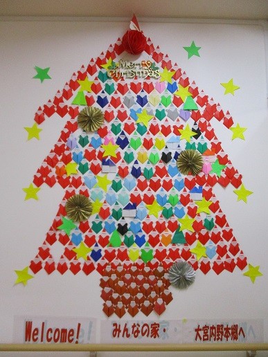 こんにちは。みんなの家・大宮内野本郷です(^。^) 花の丘公園そば。さいたま市西区。 宮原駅西口よりバス6分&徒歩4分のところにある施設です。 とうとう出来上がりました(*^^*) 1階入居者様とスタッフが沢山の折り紙でサンタクロースや家、モミの木を折って壁にペタペタ貼り… 完成したのがサンタクロースで出来たクリスマスツリーです\(^o^)/ H様は毎日リハビリ中に前を歩行練習で通るので『すごいなぁ〜出来たなぁ(^^)』『頑張ってたもんな〜』 と(*´ω`*) 皆様で作った共同作品とても素敵に出来ました☆彡
