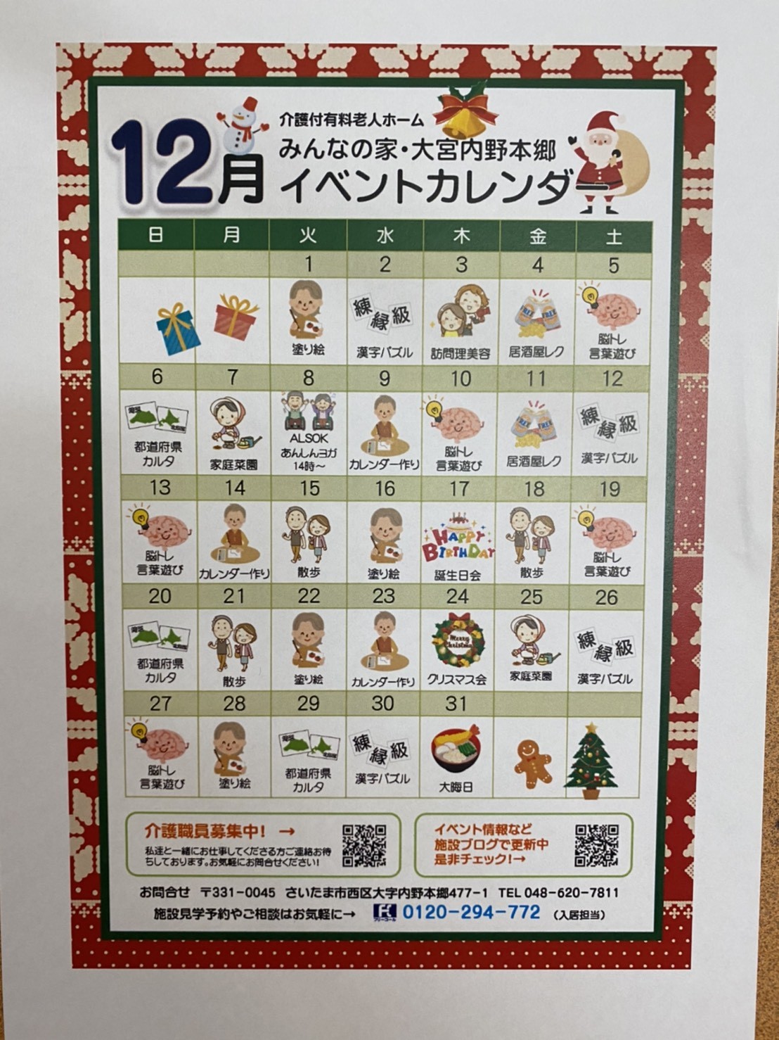 12月のイベントカレンダーが出来上がりました。 未だコロナ禍が続いておりますが、 入居者様に安心して、少しでも明るい気分で生活して頂けますよう、スタッフ一同『みんなの家・大宮内野本郷』を盛り上げていきたいと思います。クリスマス会やお誕生日会もありますよ☆