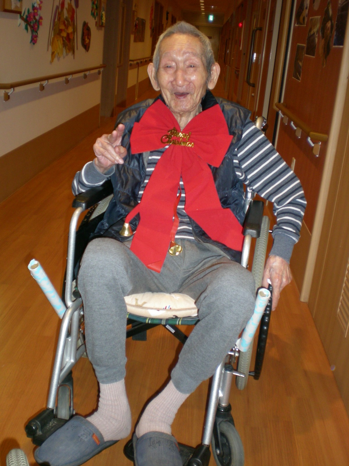 男性の利用者様も途中参加し赤いリボンを付け記念撮影!