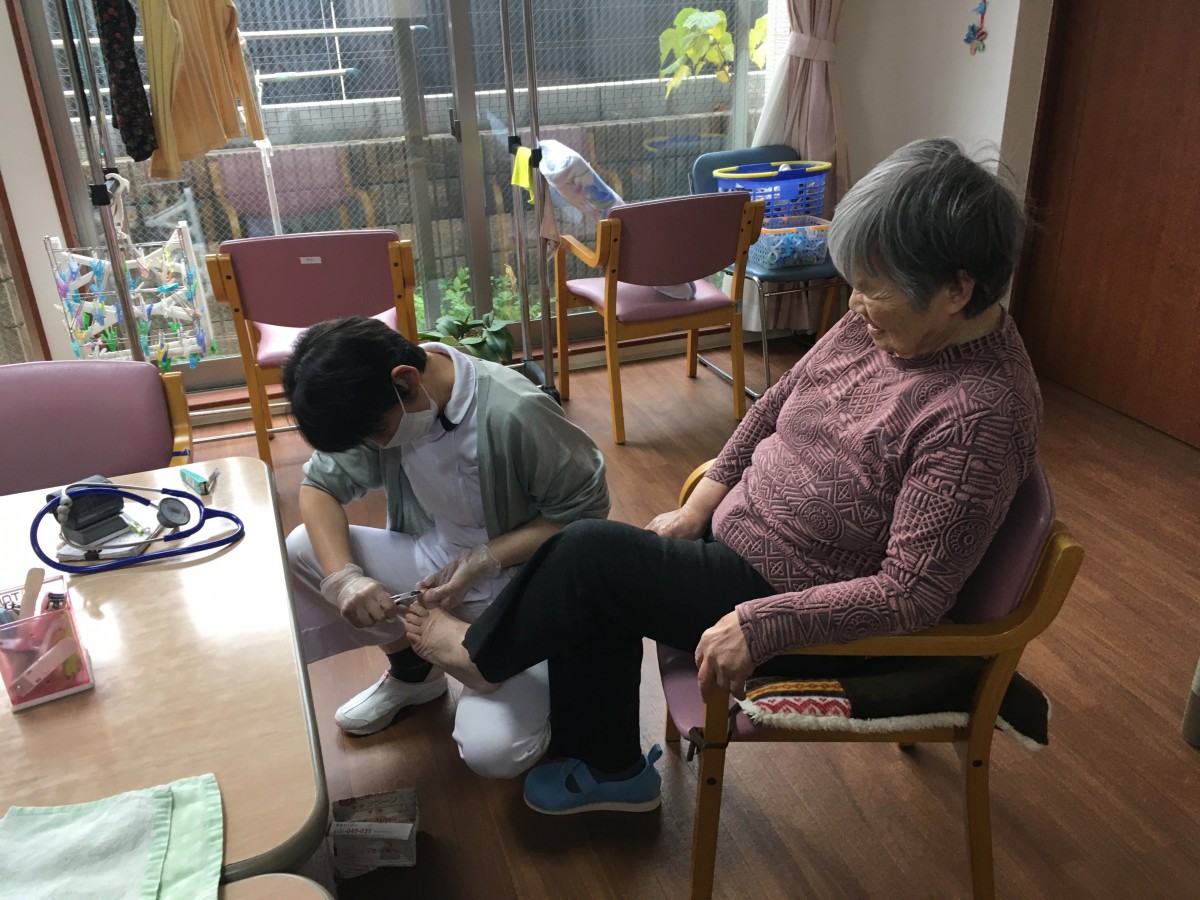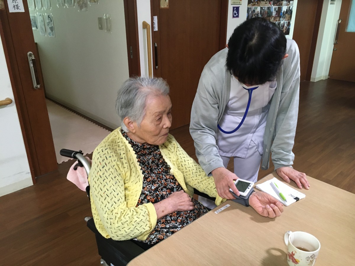 看護師さんが来たら、ファイルを確認して、利用者様一人ずつお話をしながら、バイタル、体温、お腹の音、肺音などお身体の