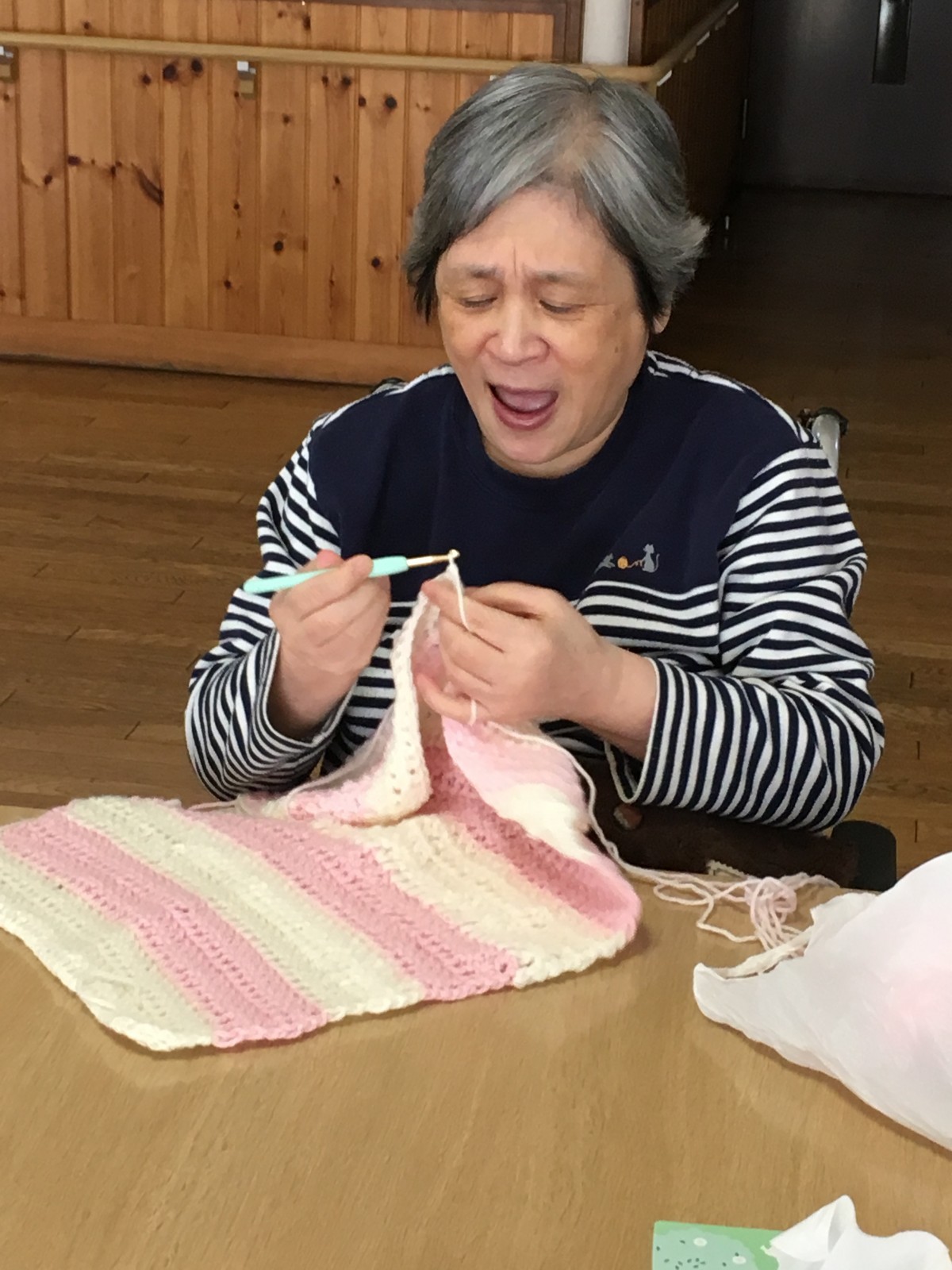 「教えてもらいながら編んでるのよ~。でも昔よりは遅くなったかなぁ」と。