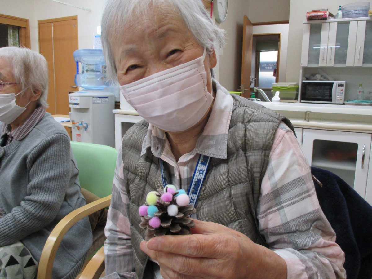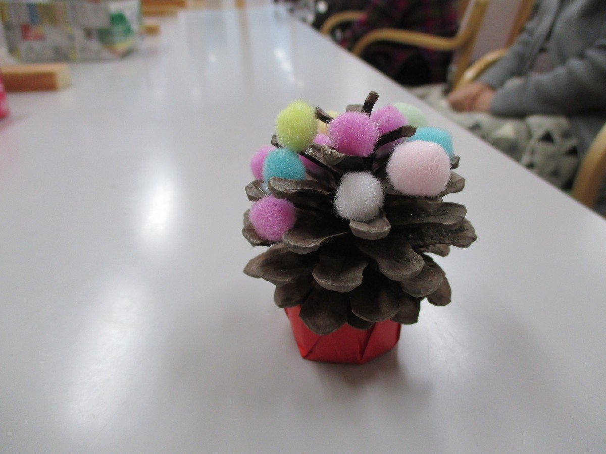 松ぼっくりを職員が集めてきて、ミニクリスマスツリーを作りました。かわいくできたでしょ????