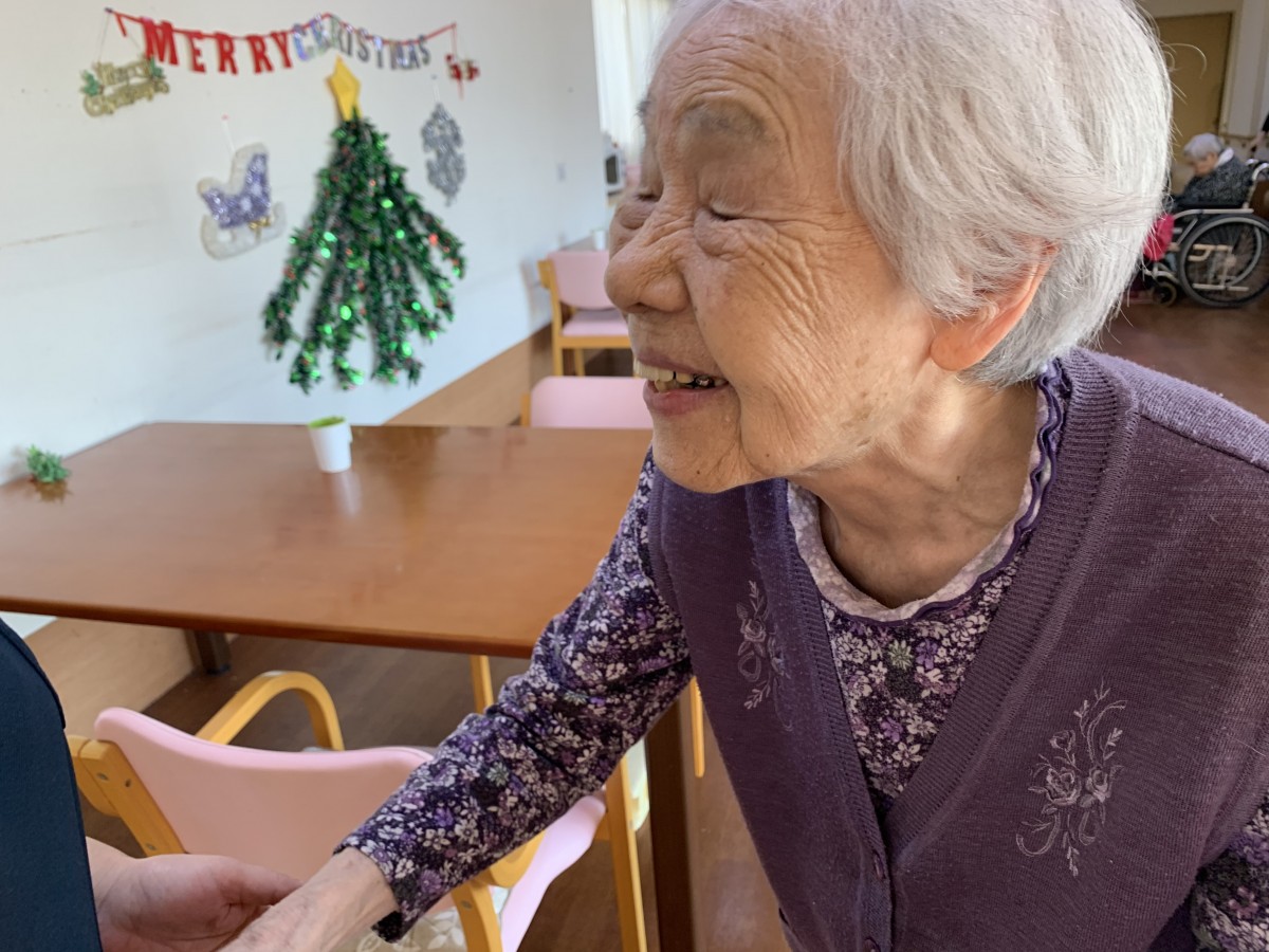 ↑お互いパワーを注入しあう、すこや家西尾久管理者と100歳
