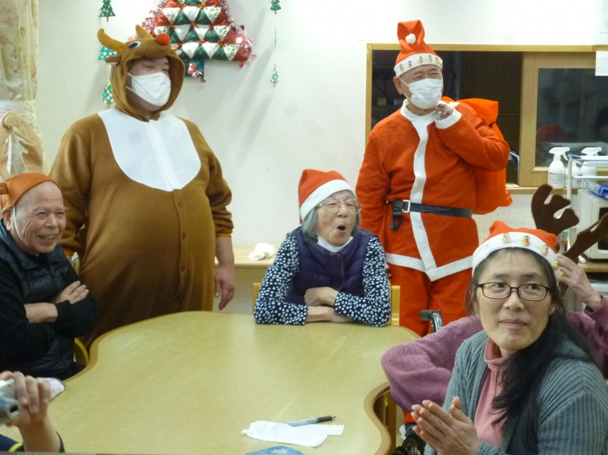 利用者様はサンタさんとトナカイの登場に