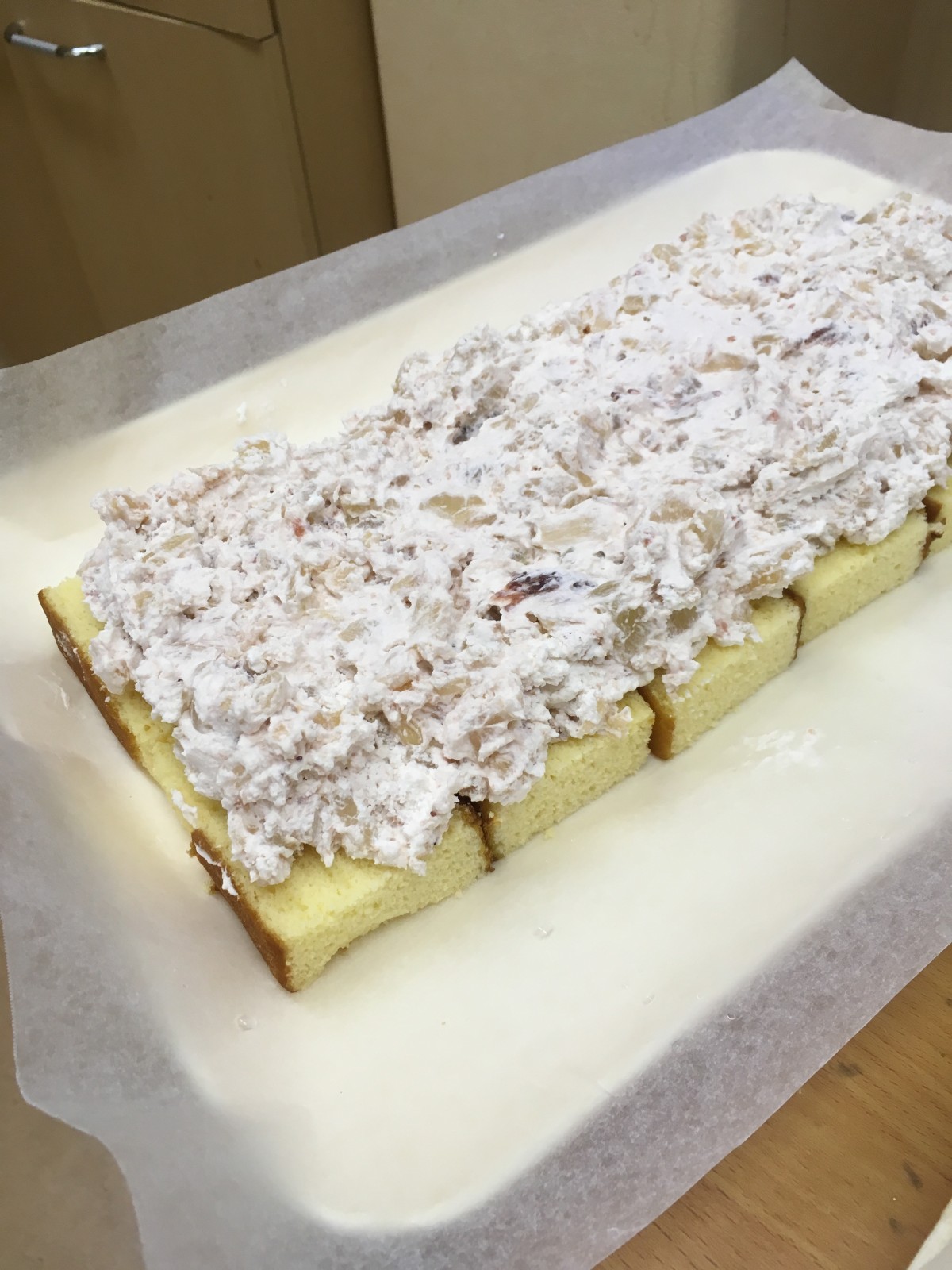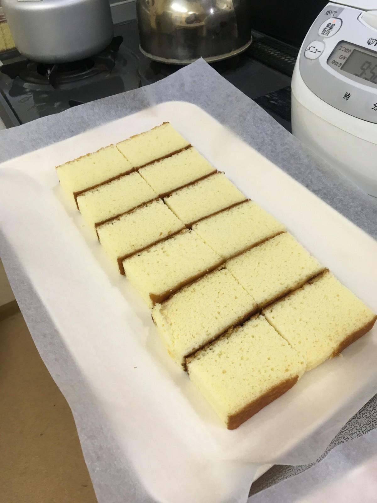 平らに慣らした後、その上にカステラを敷き、