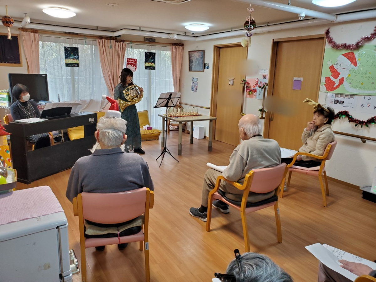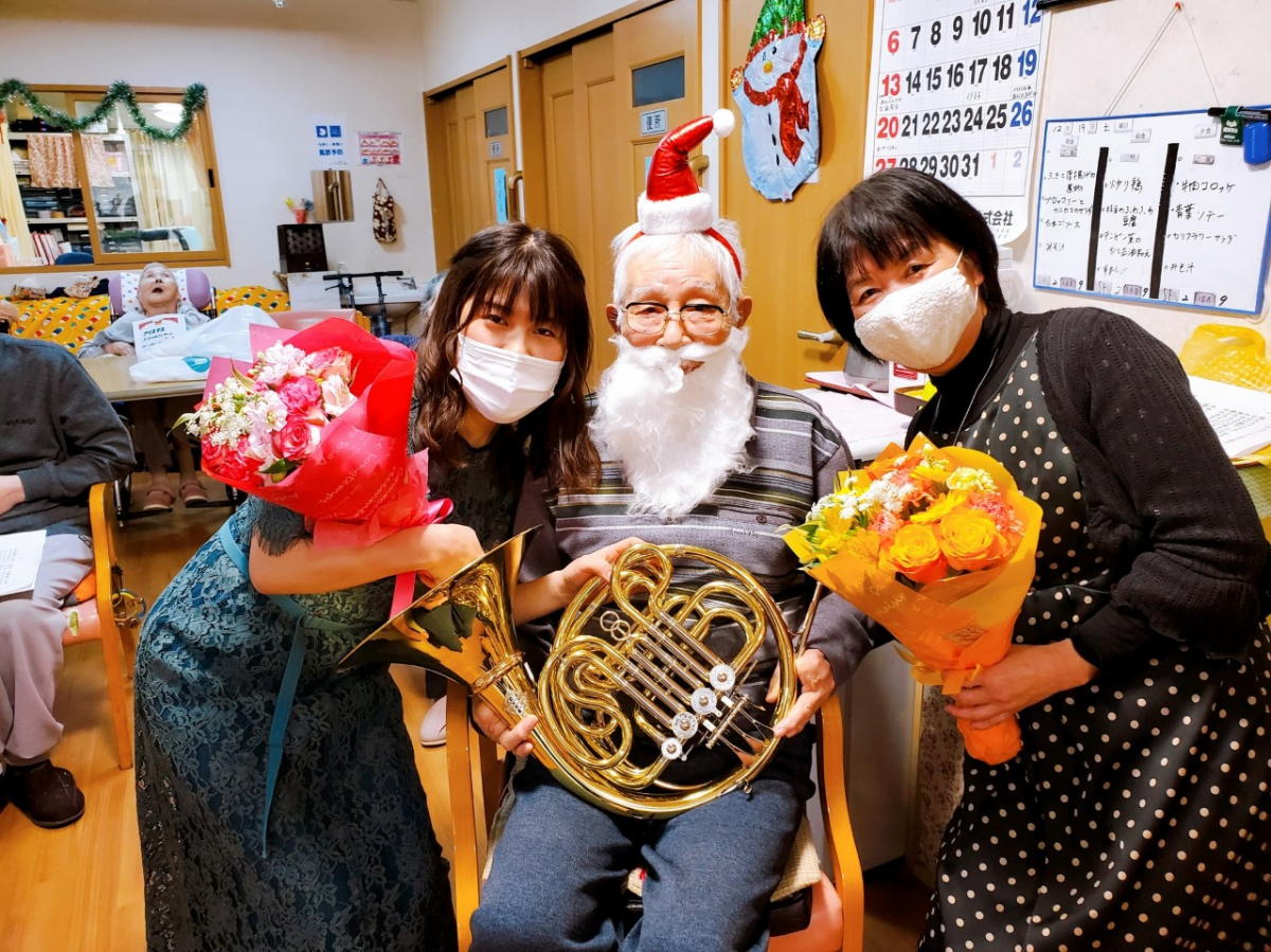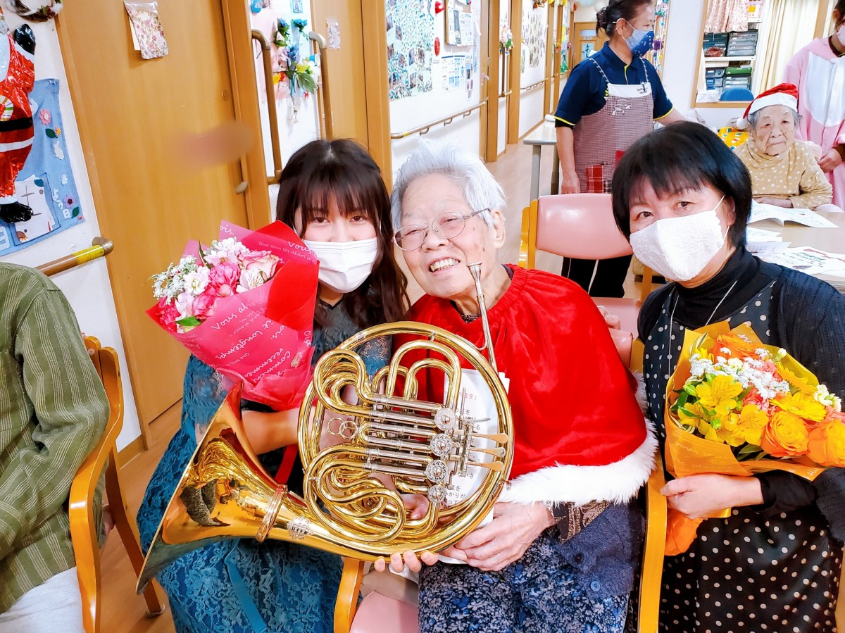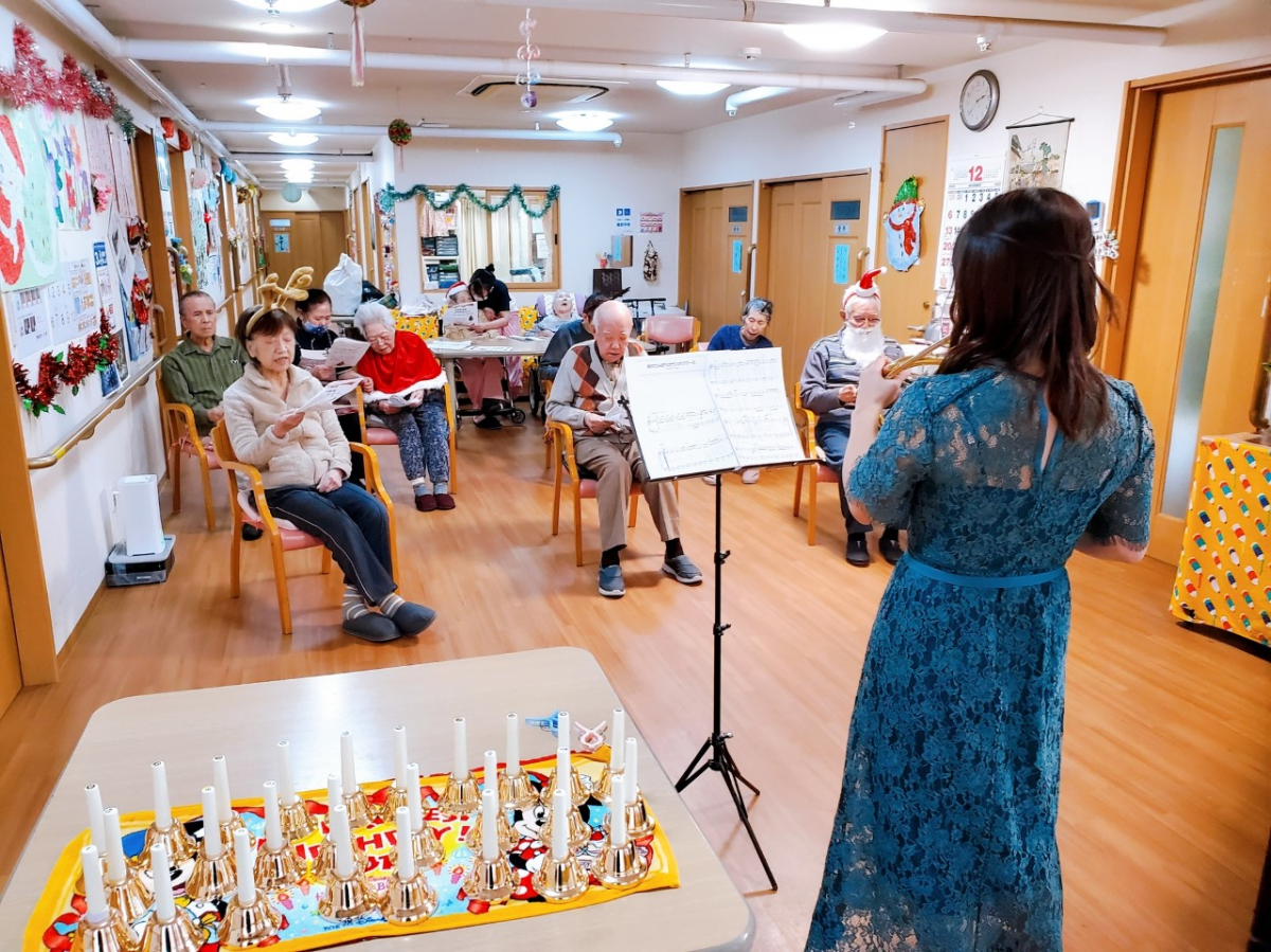ホルンとピアノ演奏による数曲を楽しんだ後は、ピアノ演奏ケアスタッフがクリスマスという事でハンドベル奏者に早変わり!