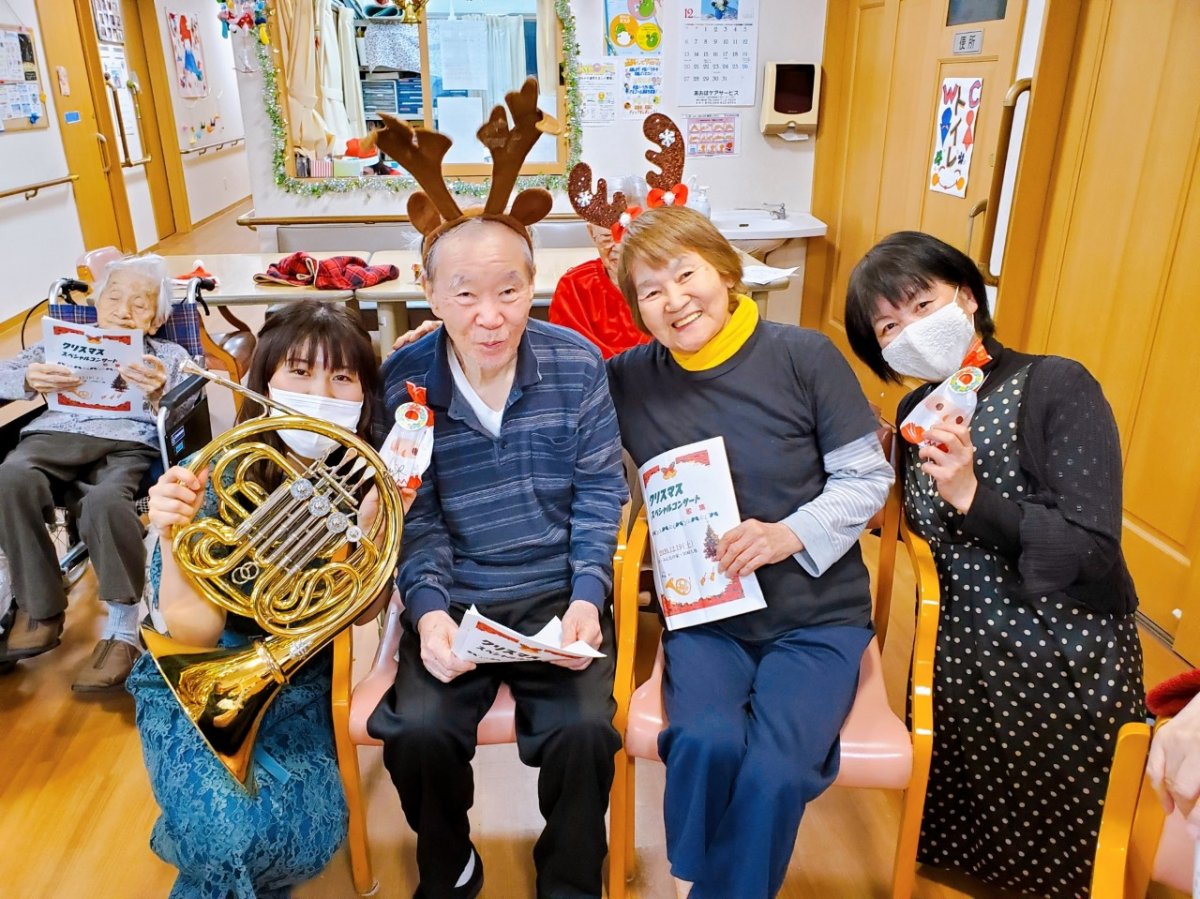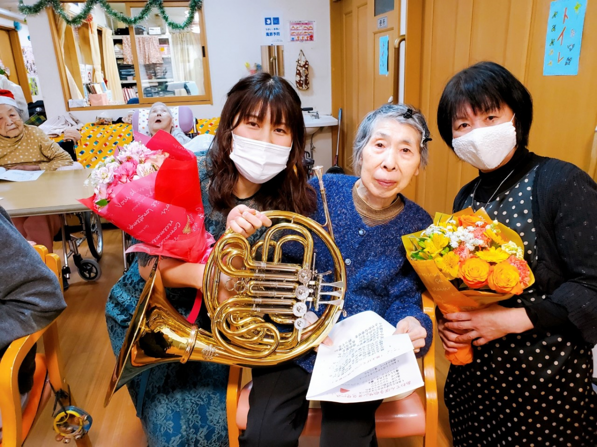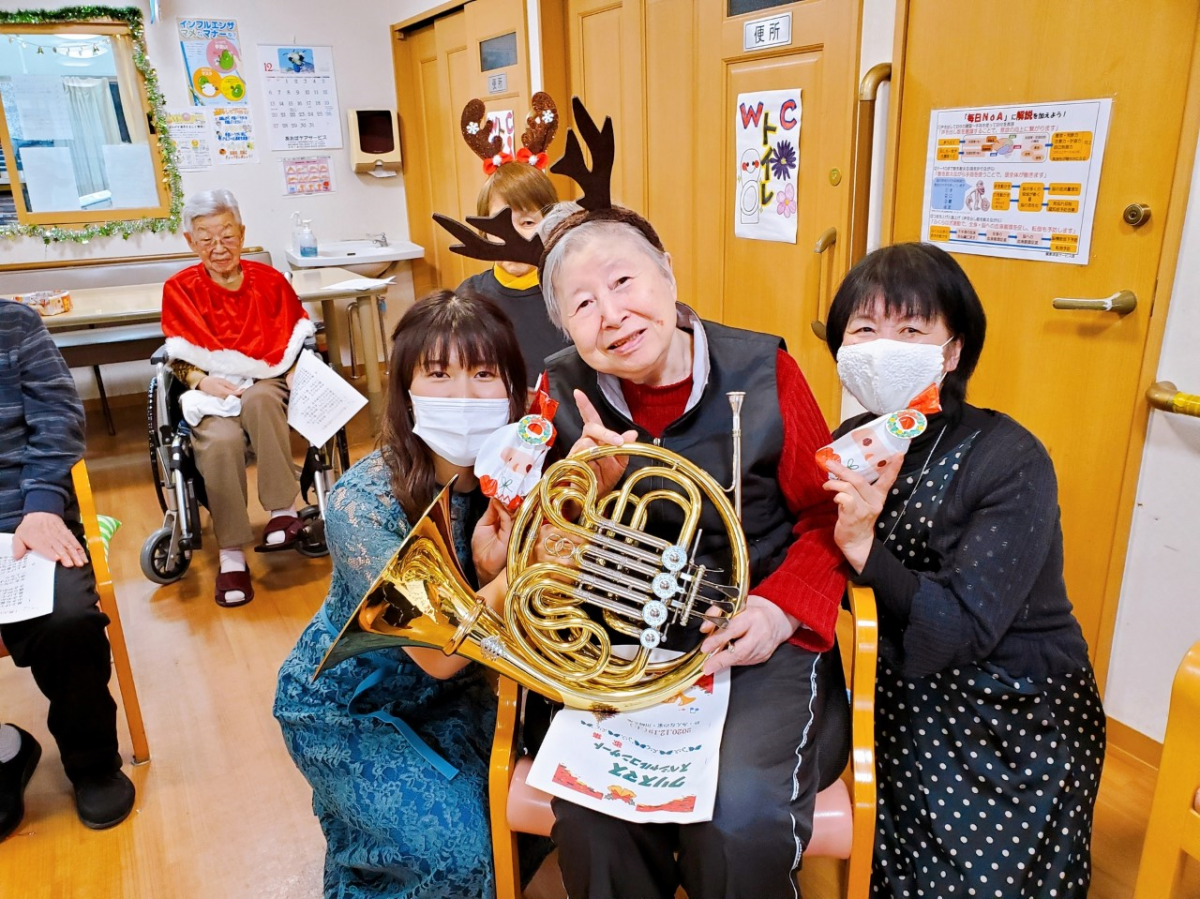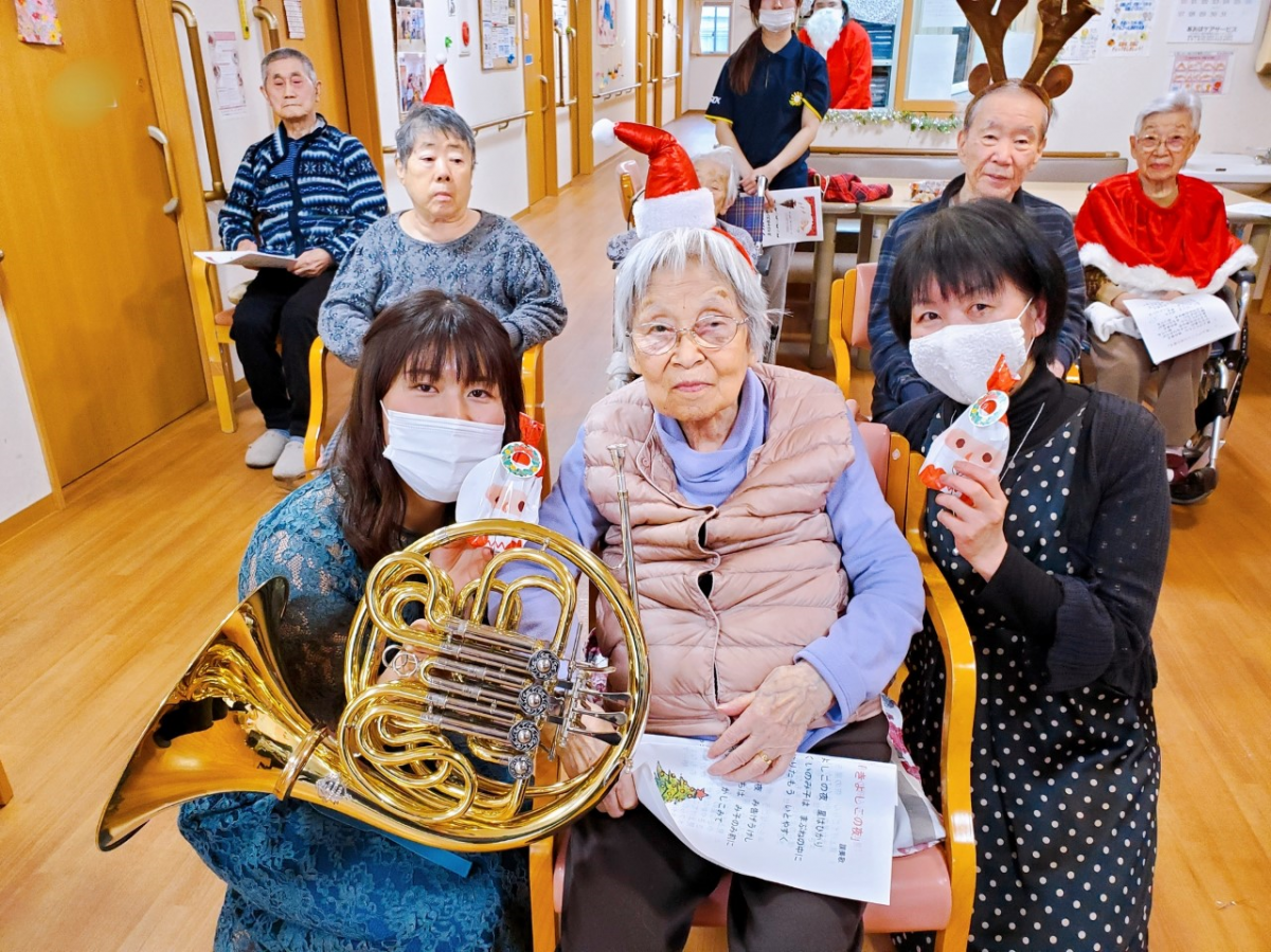 ホルンとピアノ演奏による数曲を楽しんだ後は、ピアノ演奏ケアスタッフがクリスマスという事でハンドベル奏者に早変わり!