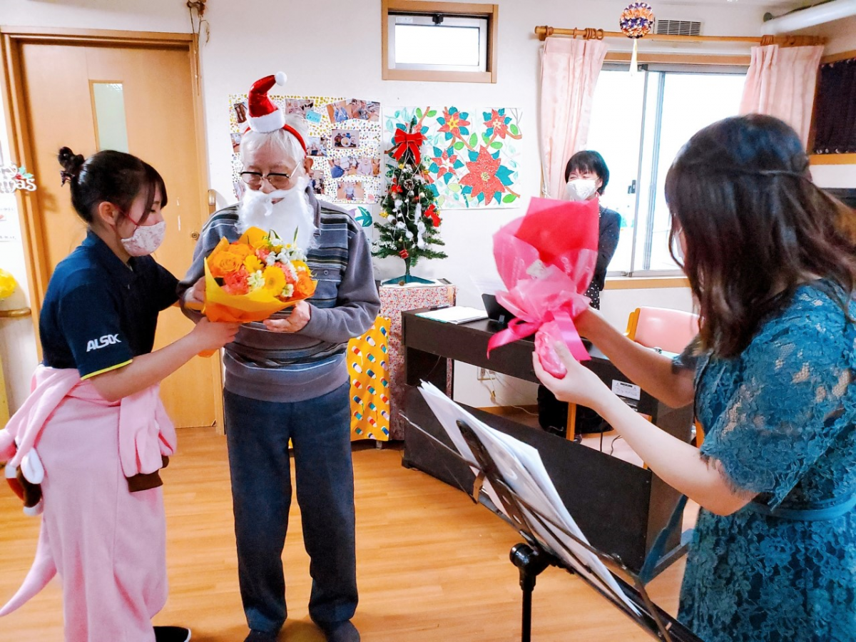 最後に各フロア代表した利用者様から花束、プレゼントを演奏者のお2人に贈呈しました。