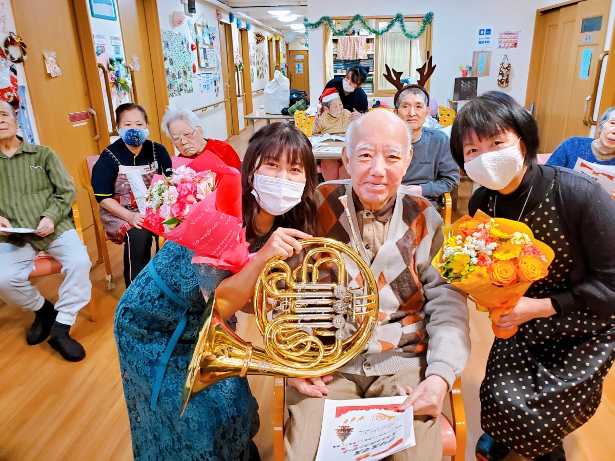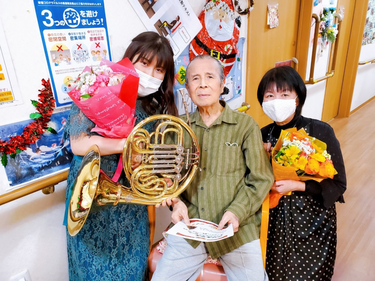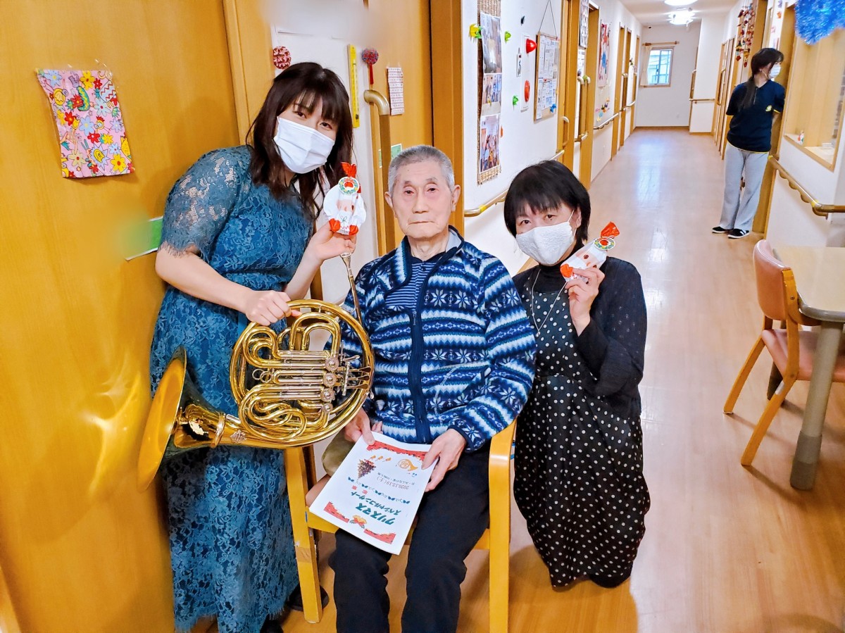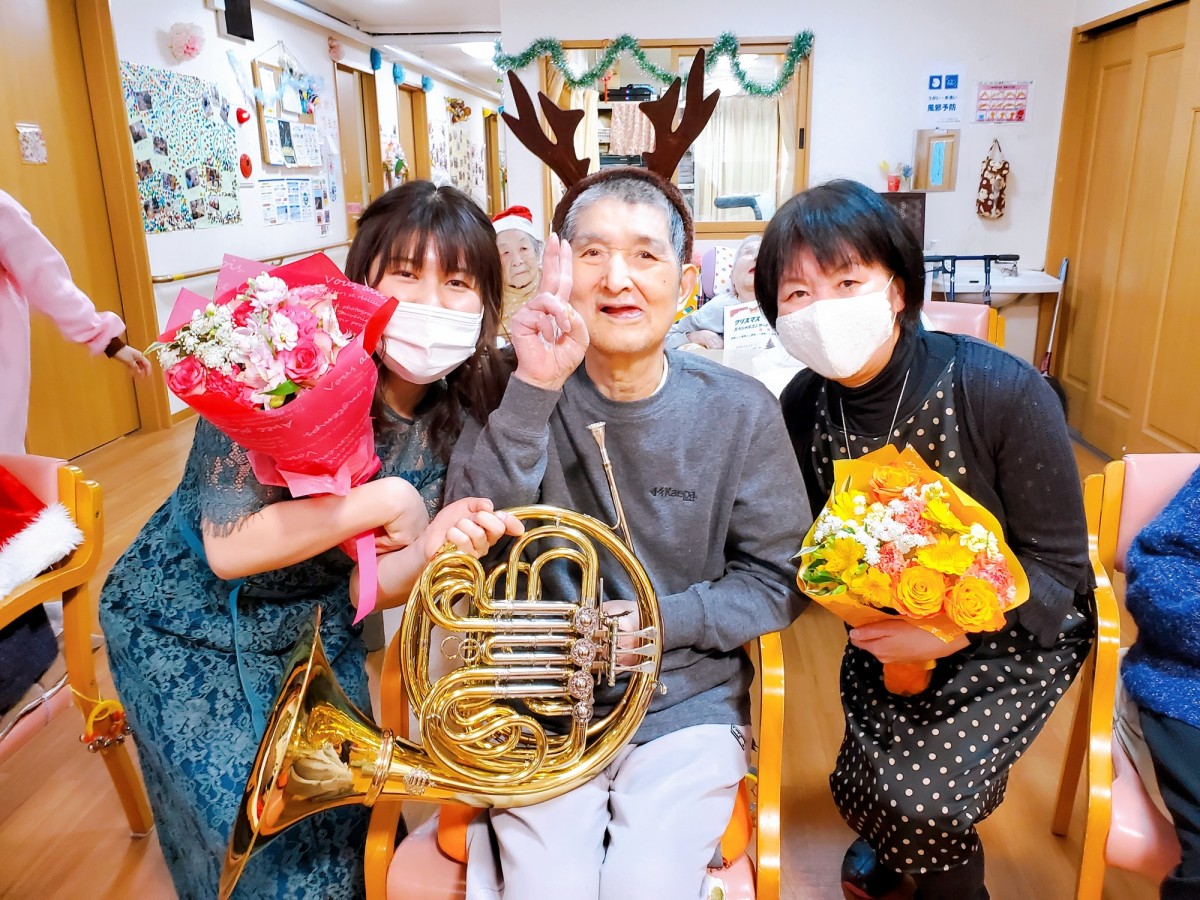 本来ならば全員で集合写真を撮りたかったのですが、密を避けるという事で、演奏ケアスタッフと利用者様でお写真を撮らせて頂きました。