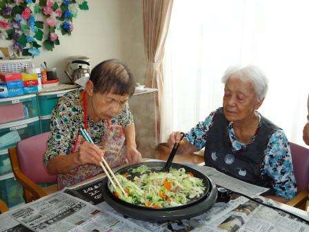 「焼きそば」は野菜切りから始まり、上手に炒めて出来上がり。皆さんで美味しく食べて大満足です。