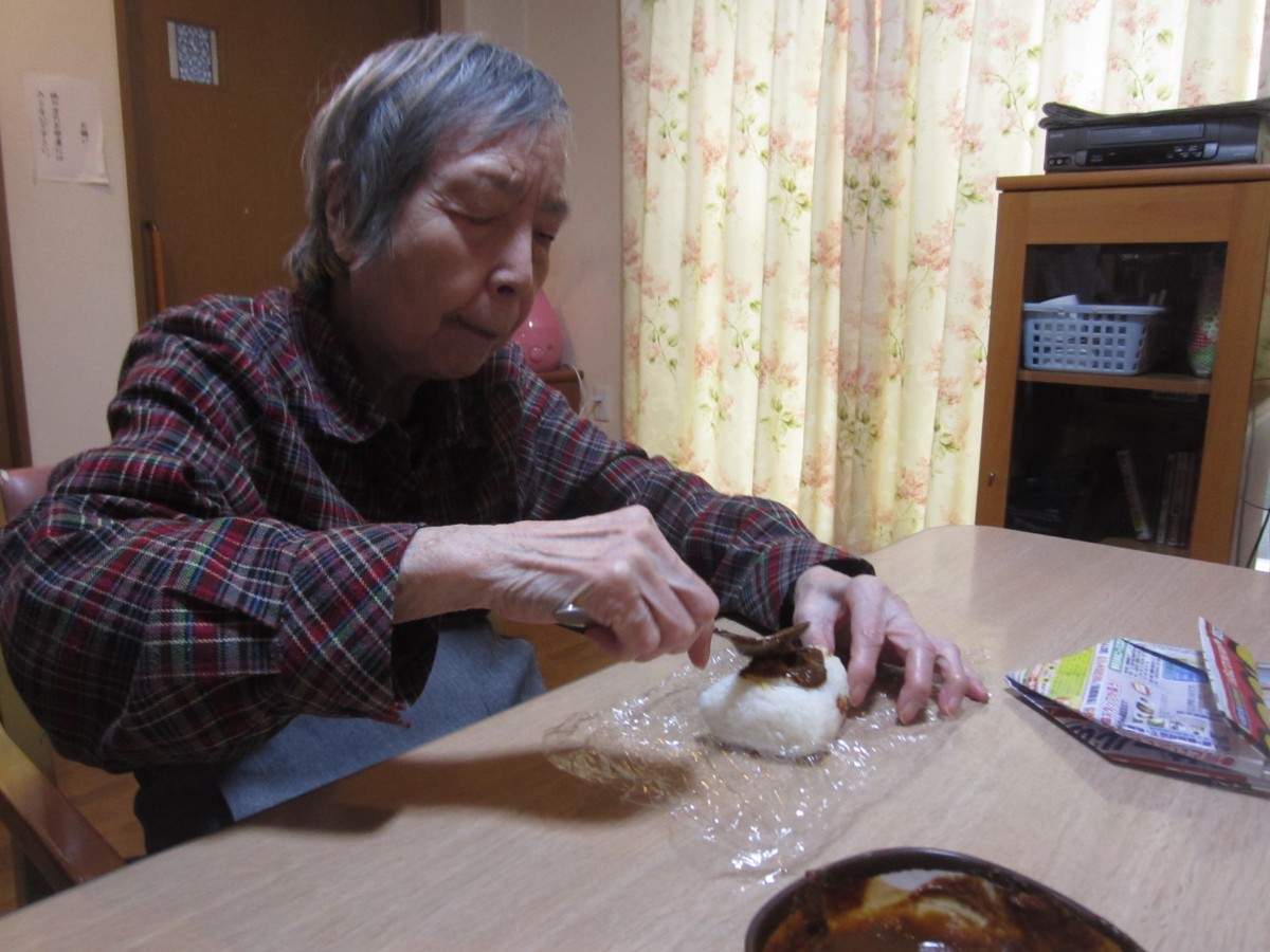 職員が、余ったご飯をサランラップに小分けにしてご利用者様におにぎりを