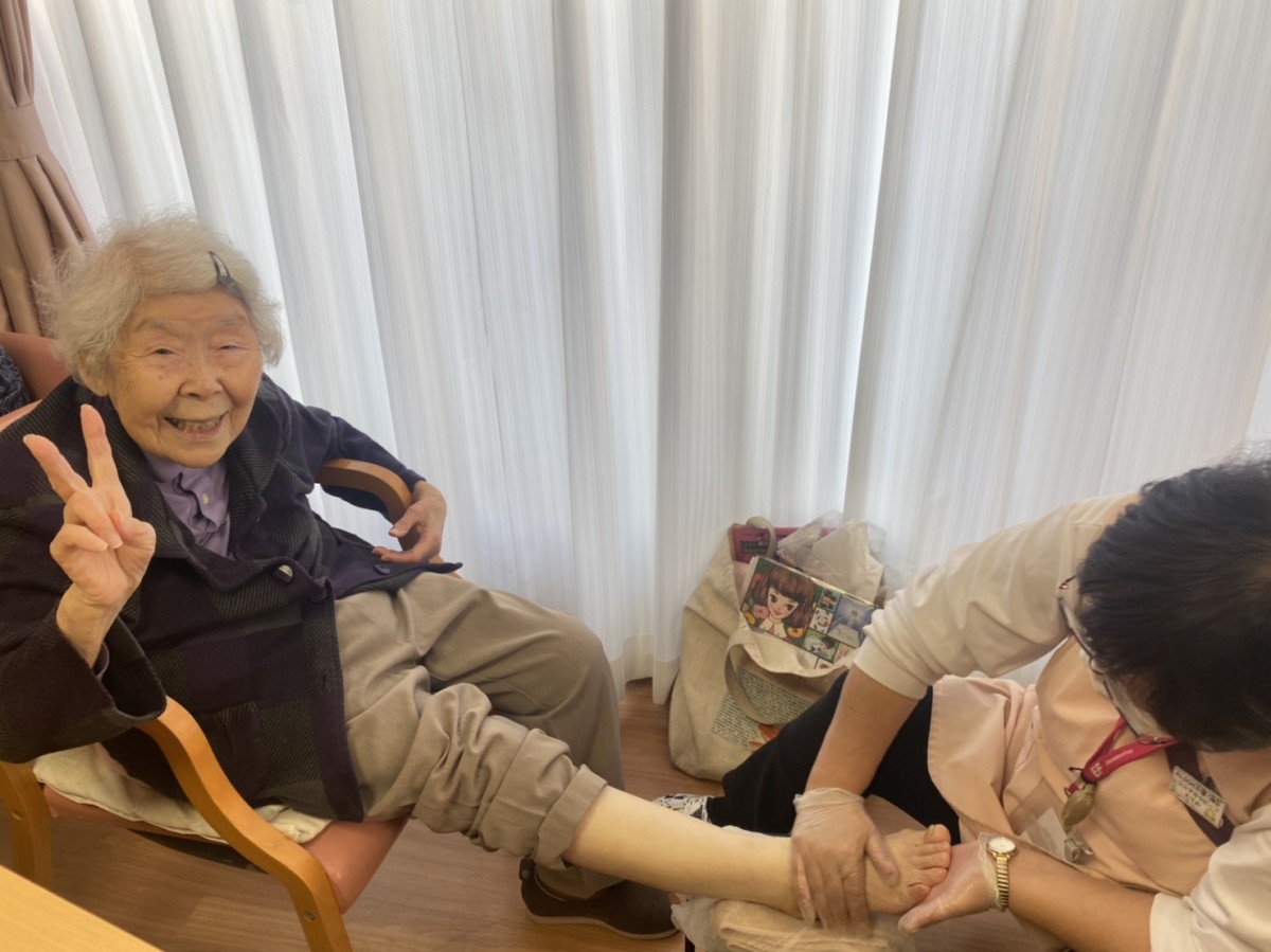 今日は入居者様お待ちかねの『シニアセラピー』の日でした♡ 足裏療法・顔面療法の施術で、足の浮腫や冷えの改善、嚥下機能の改善・向上が期待出来ます。 セラピストによる、優しい手のぬくもり♡対面によるそれぞれの方に合ったコミュニケーションを図れるメリットもあります。皆様、大変気持ち良さそうでしたよ〜♬