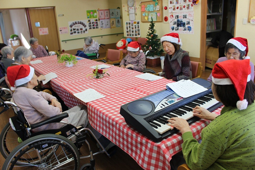 写真のご様子は元ピアニストであられるご利用者様の演奏にて、皆様で楽しくクリスマスソングを歌っている様子です。