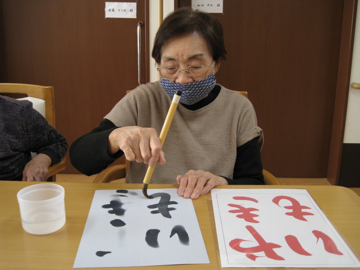 午前中、書初めでは「正月」「賀正」「ゆめ」「牛」「やきいも」を筆で書きました。