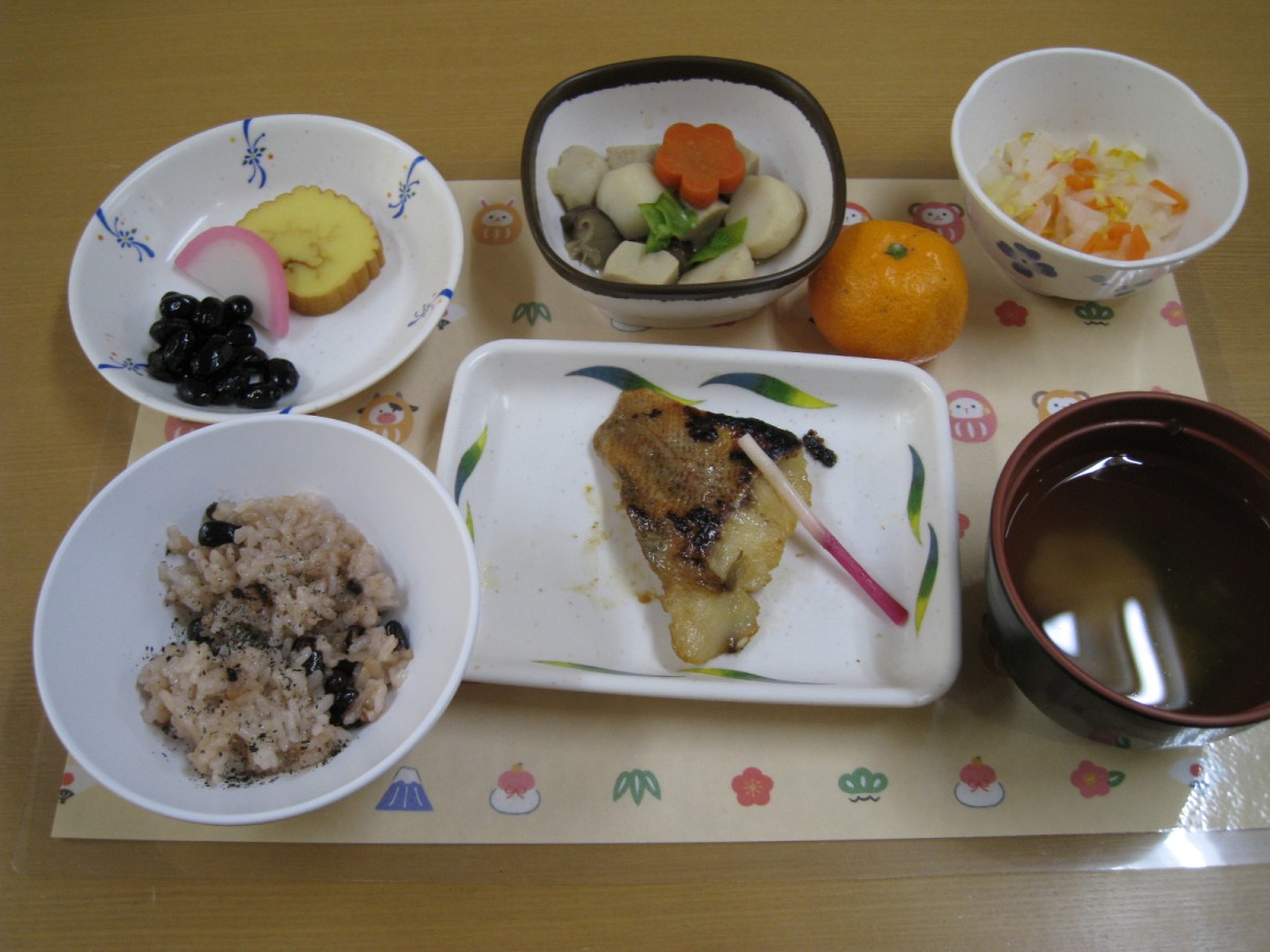 昼食ではおせち料理で、赤飯・お吸い物・赤魚の西京焼き・煮〆・伊達巻・黒豆・蒲鉾・紅白なます・みかんが出ましたが、みんな食べてしまいました。