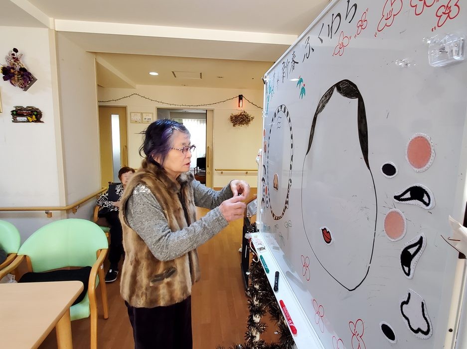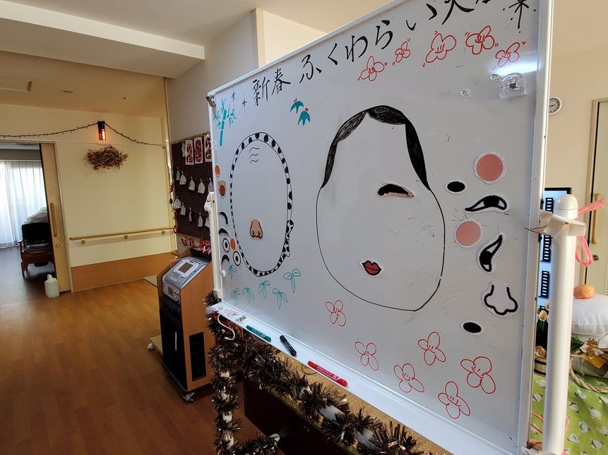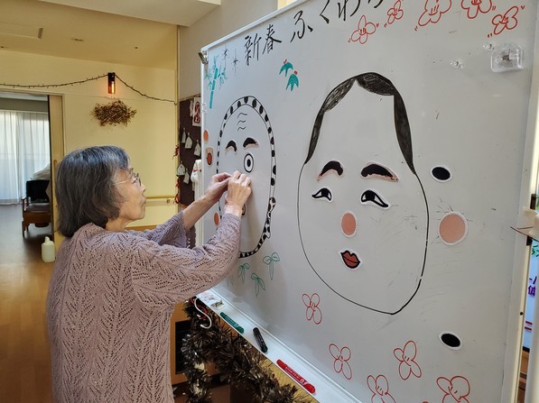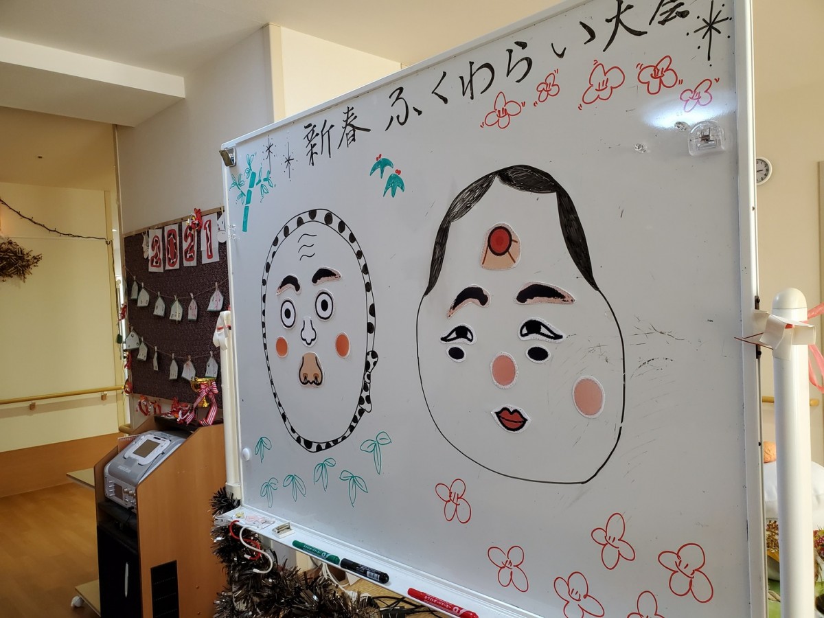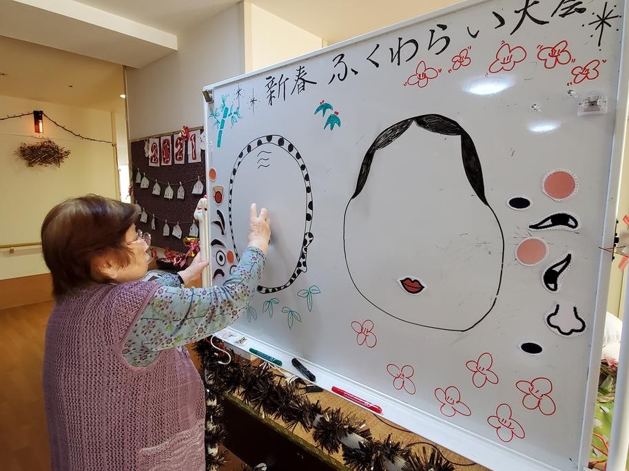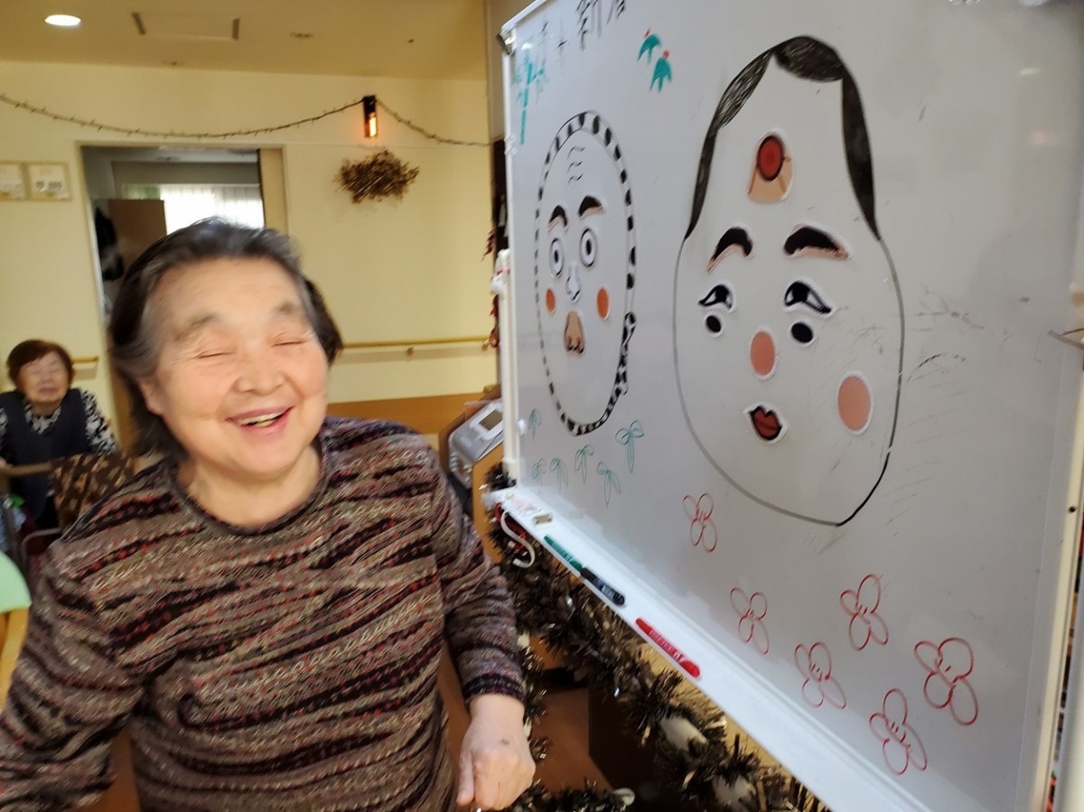 今回の福笑いは、ホワイトボードを使用したご入居様皆さんで参加型の福笑いを開催致しました♪