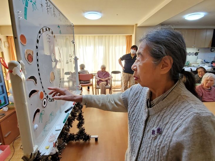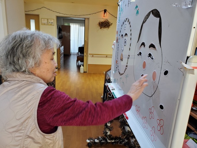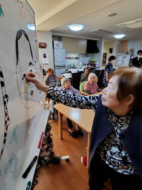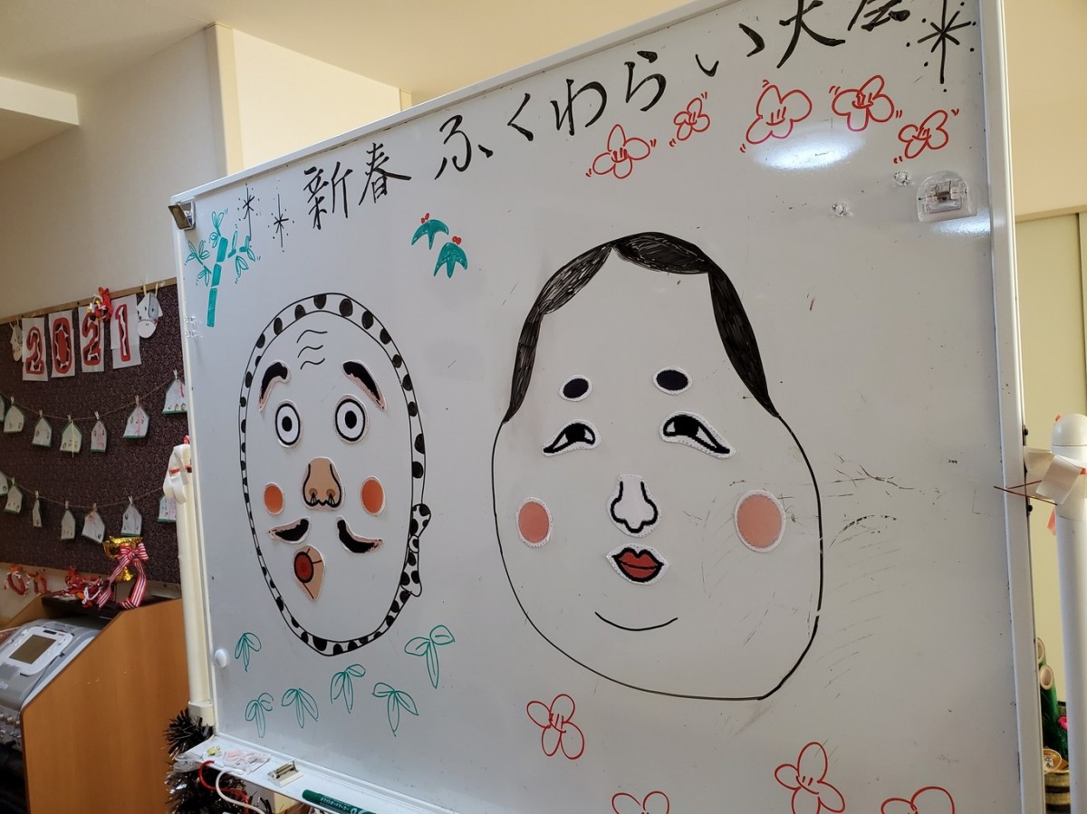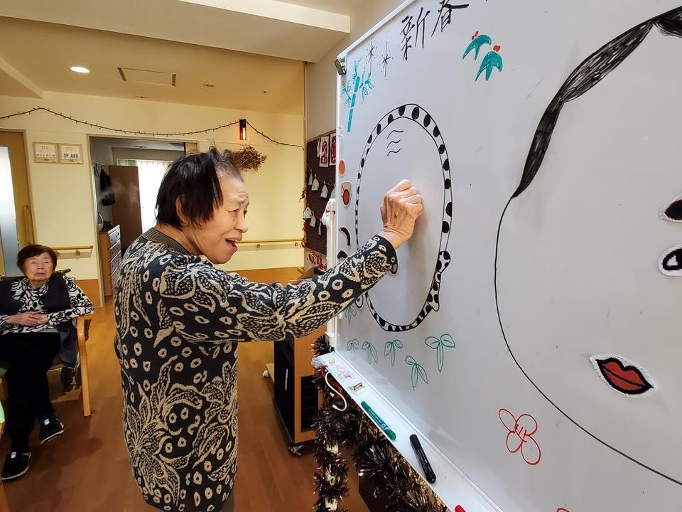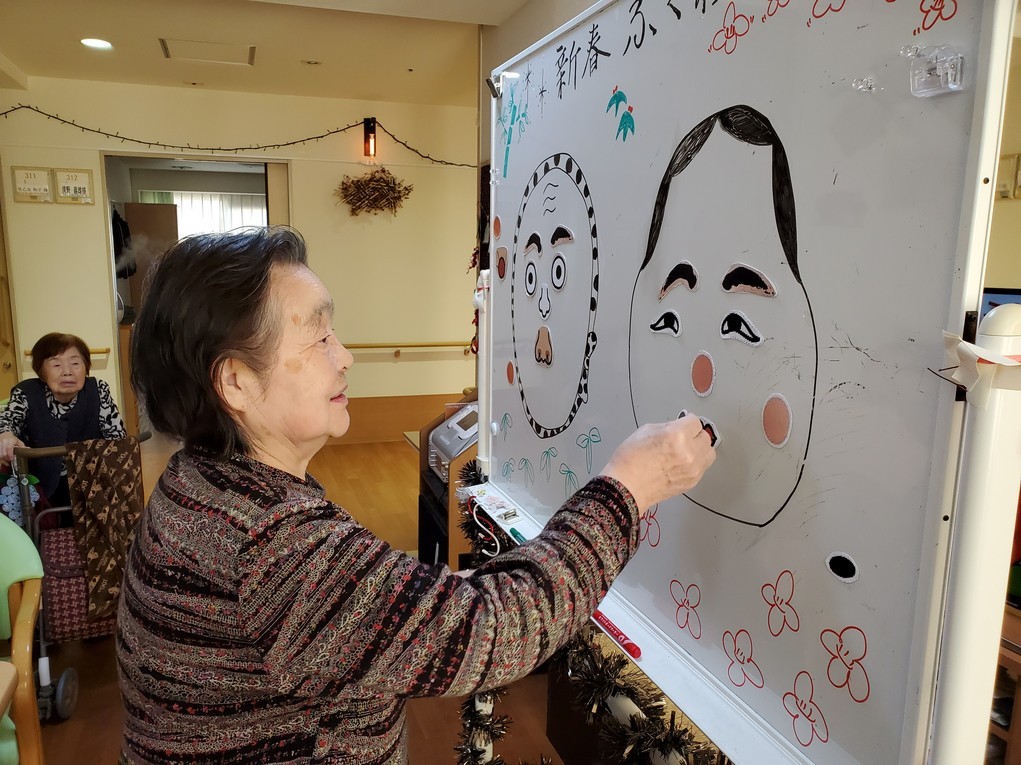 今回の福笑いは、ホワイトボードを使用したご入居様皆さんで参加型の福笑いを開催致しました♪