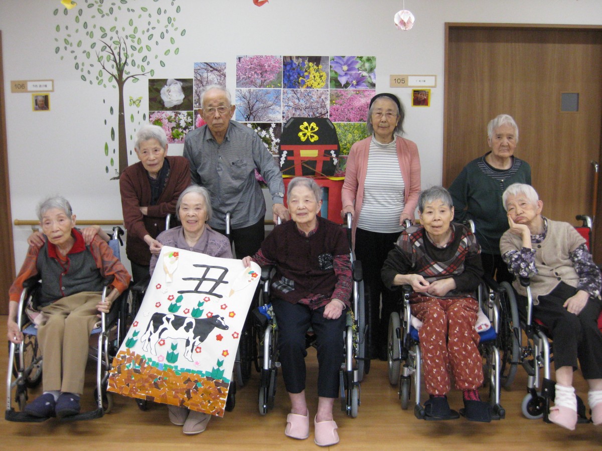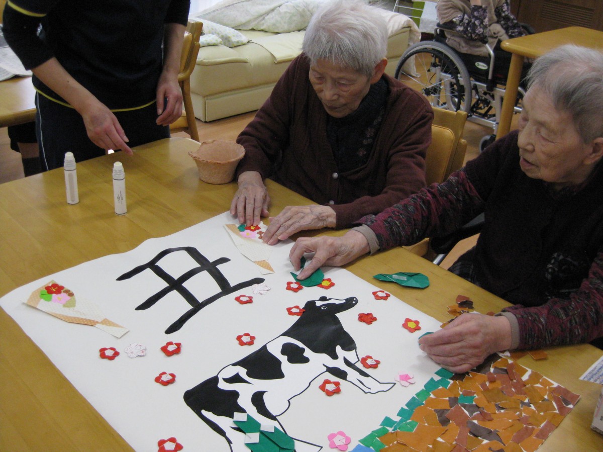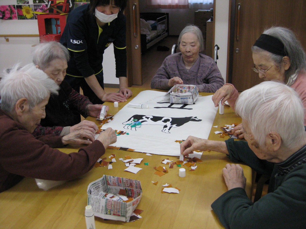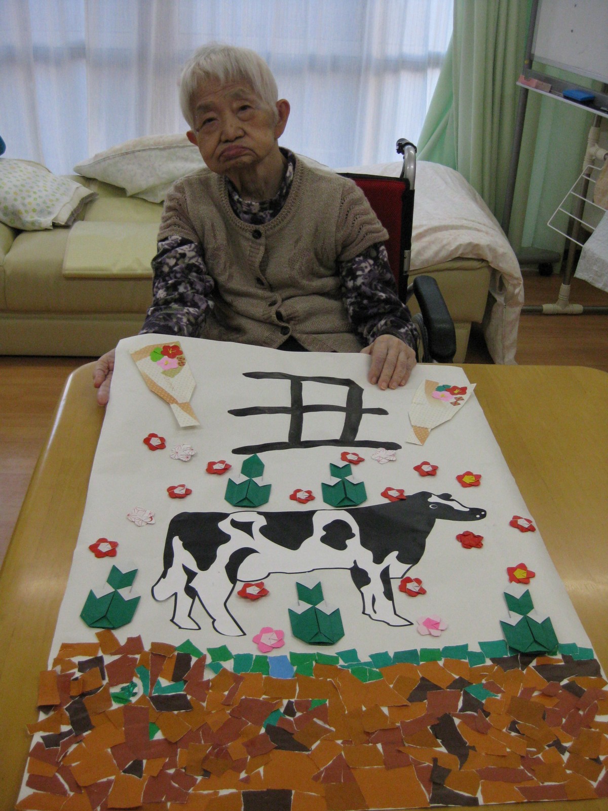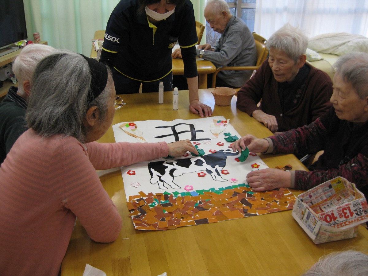今年の干支は丑年ということで、みんなで貼り絵を作りました(^^)/
