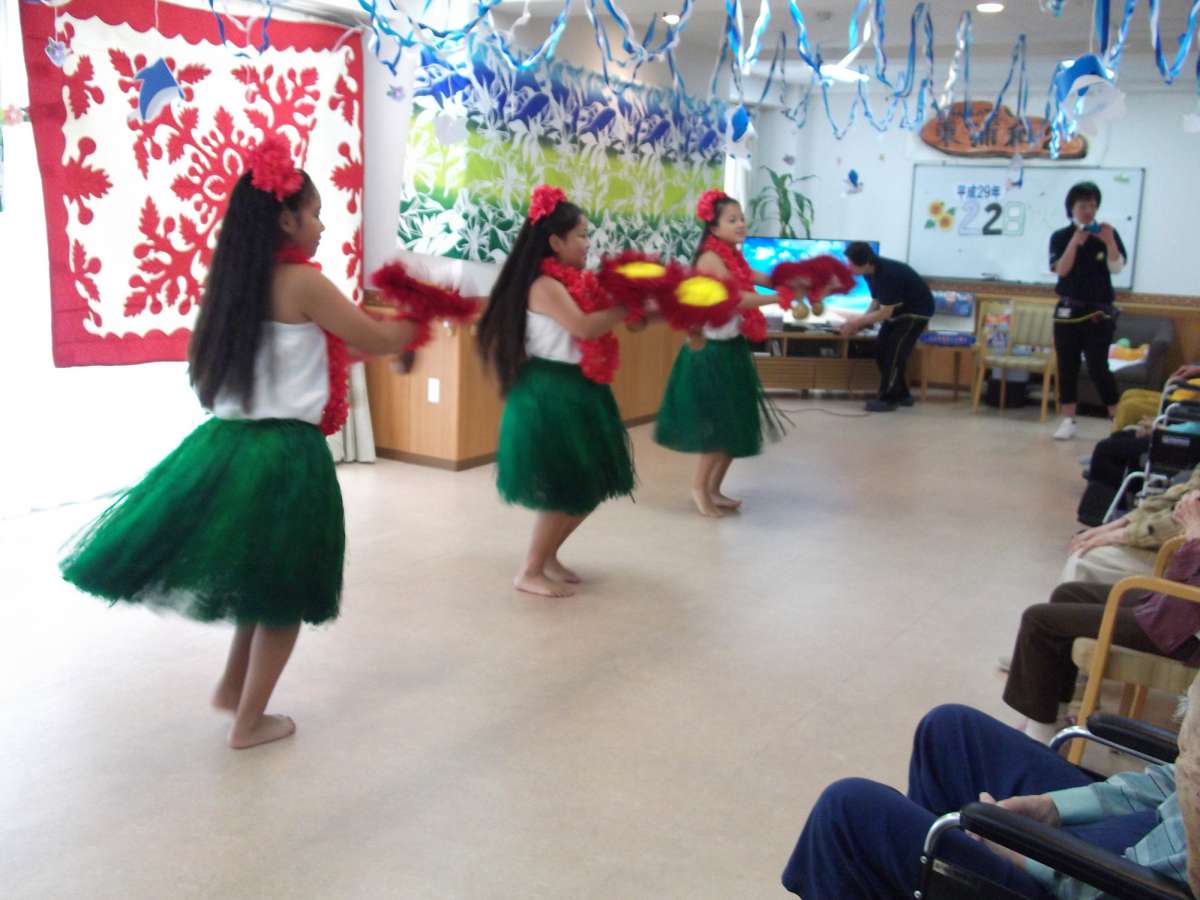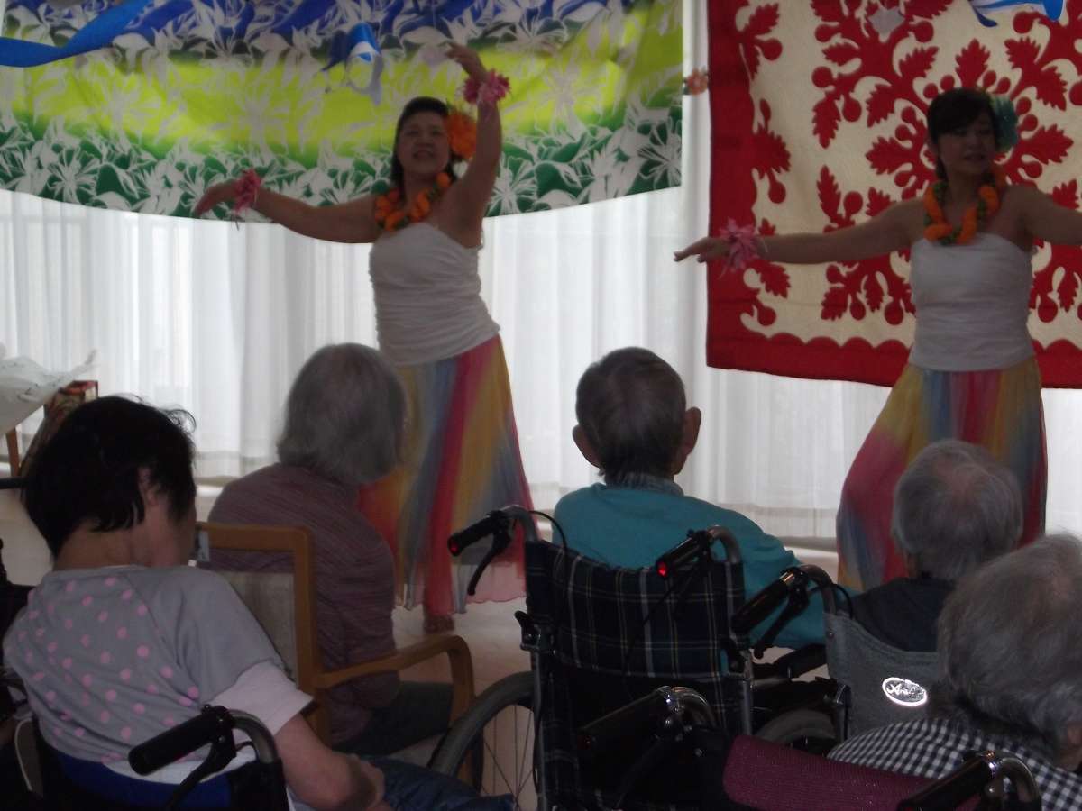 を行いました。フラダンスでは、踊りと利用者様に振付をして頂き一緒に踊りました。