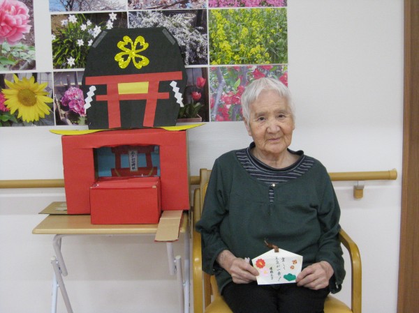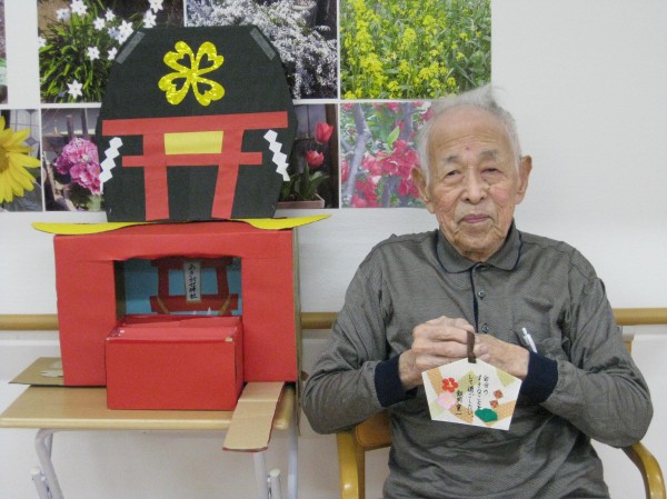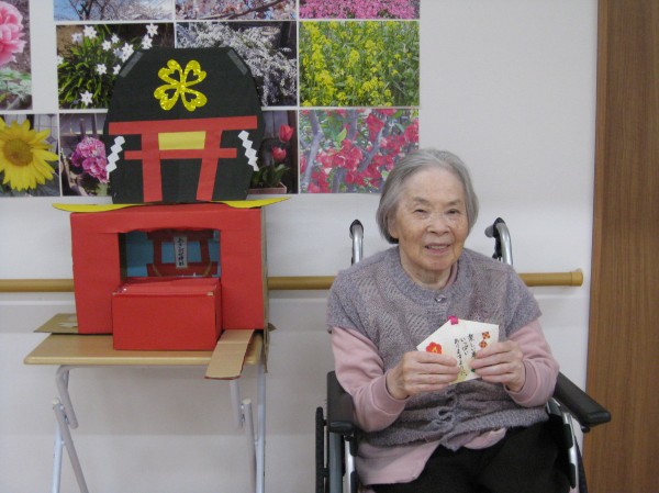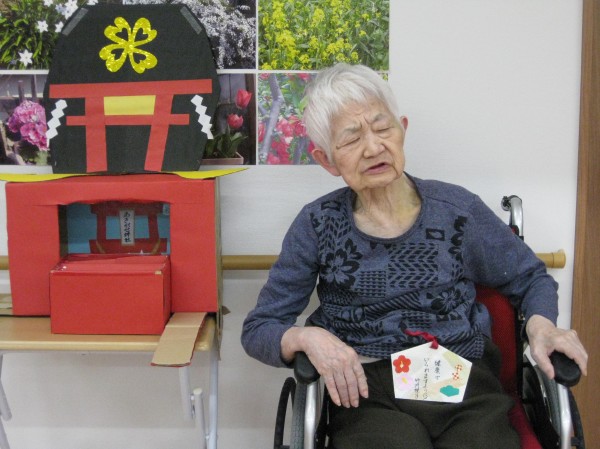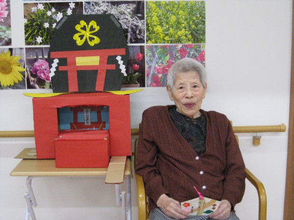 こんにちは!グループホームみんなの家・あきがせの介護ブログです。よろしくお願いいたします。初詣をしました。コロナ過で実際には出かけられない為ホームで神社を手作りしてお参りした気分を味わっていただきました。何をお願いしたのかしら?? 忘れた・・・ 健康で楽しく過ごせるようにお願いしました。スタッフもコロナが一日も早く終息して笑顔が絶えないあきがせに戻りますように・・・!!