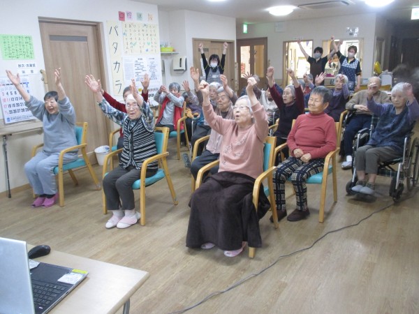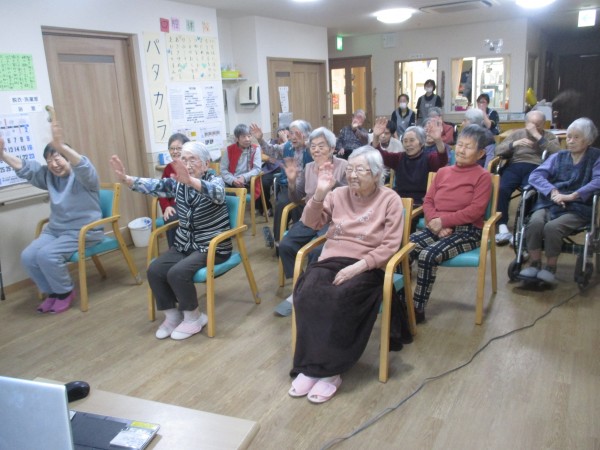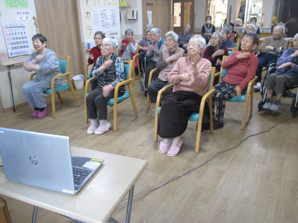 高橋先生の写った画面と職員の動きを見ながら、皆様一緒に脳と手、脚の運動をして頂きました。