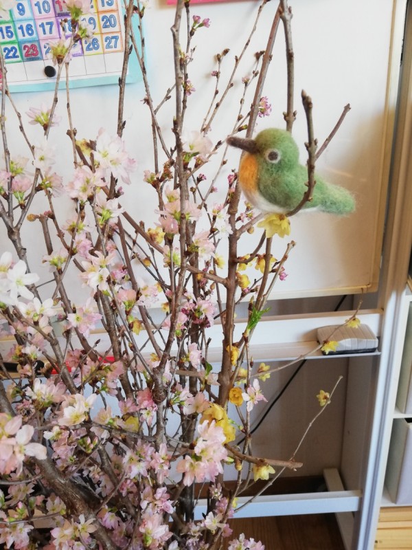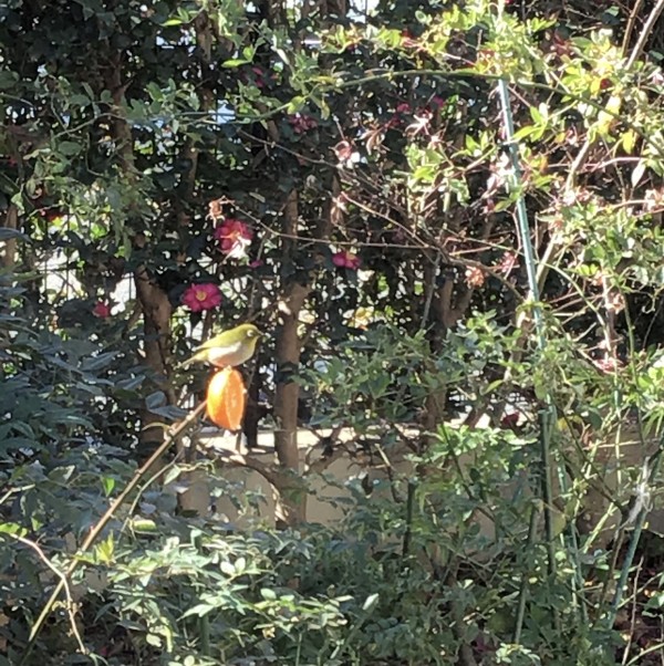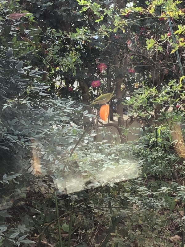 お庭に本物のめじろが2羽顔を見せに来てくれました。